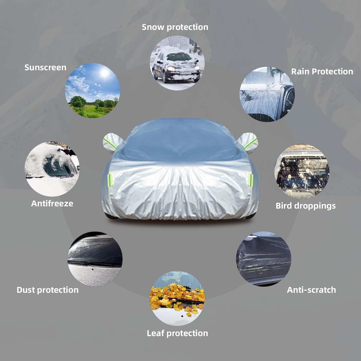 - ăPremium Materială Our all weather car cover is crafted from high-quality aluminum film, ensuring superior waterproofing and enhanced durability against wear and tear. It effectively protects your vehicle from harmful UV rays and keeps it cool in sweltering heat. The upgraded high resistance, spunlace cotton inner lining, provides advanced water absorbency, while safeguards your car's paint with soft and gentle texture.