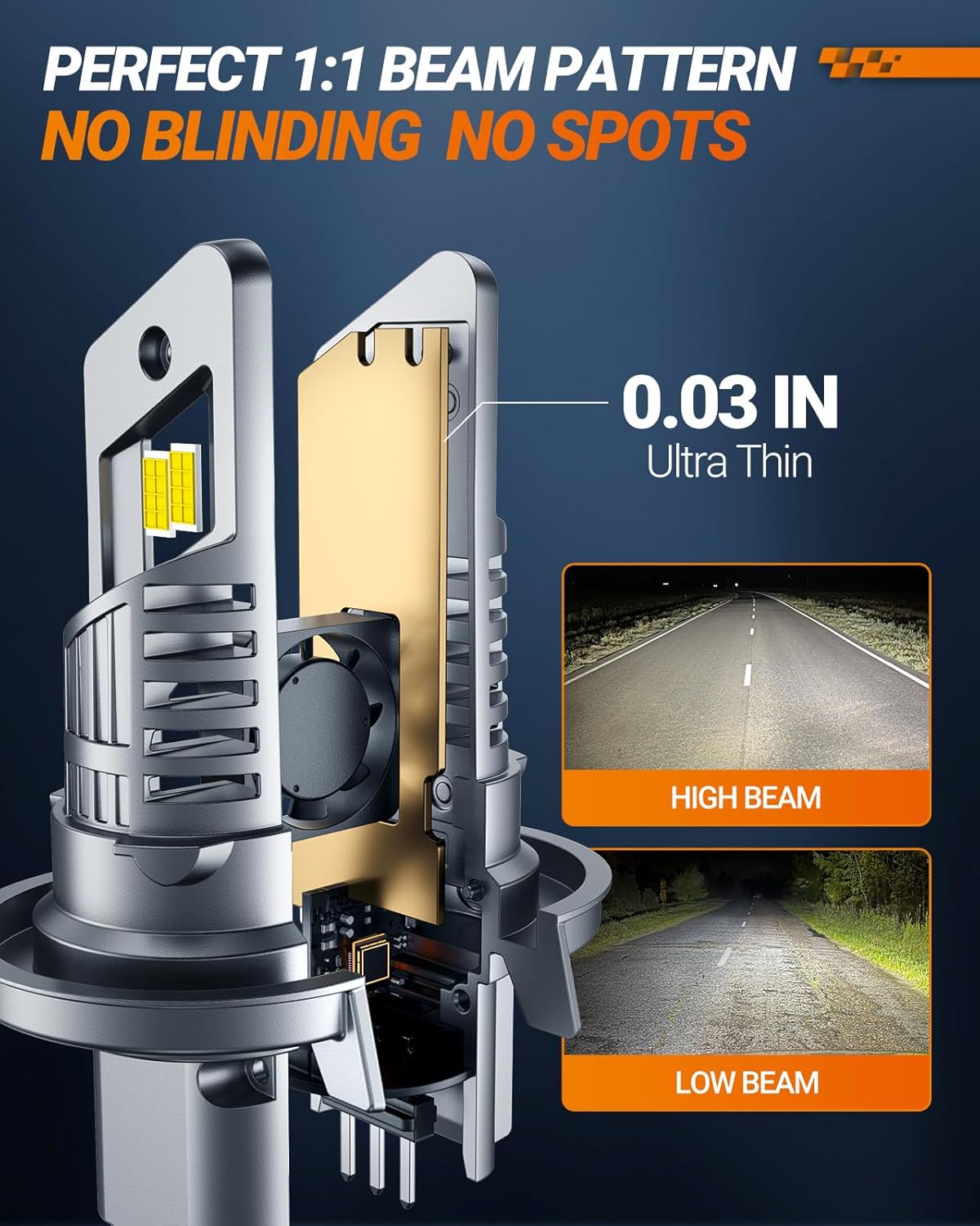 - 【Pefect 1:1 Lighting】The 0.03-inch ultra-thin copper substrate addresses issues like flickering and dimming. The focused lighting minimizes disturbance to oncoming traffic, enhancing safety on the road