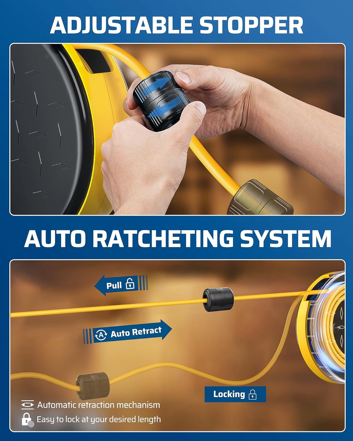 - 【 Automatic Retractable 】 The power cord reel retracts quickly and smoothly with a clever auto-guide rewind mechanism to avoid kinks and tangles; the unique twist-lock stopper will lock the cord at any length and allow you to quickly store it when finished