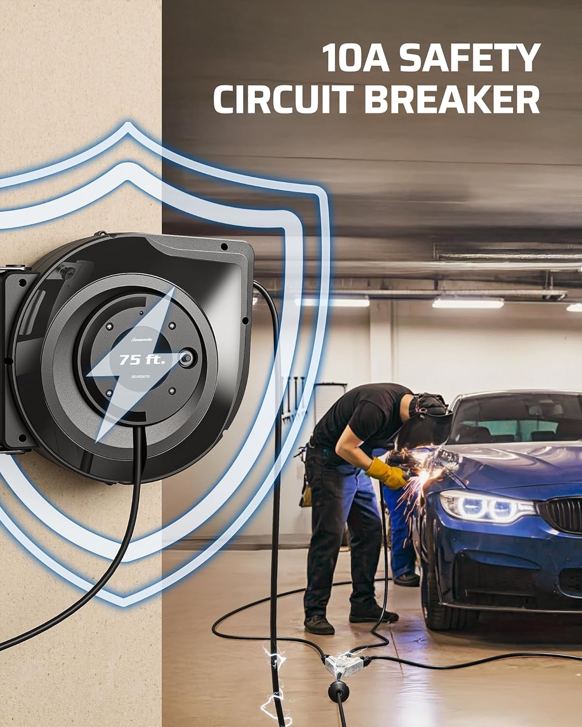 - [Auto-retracting & Auto-fixing] Our extension cord wheel has an auto-guide rewind system to prevent kinks and tangles; retracts smoothly at a steady pace, ensuring safety for children, pets, and the elderly, with a ratcheting mechanism to lock the cord at any length