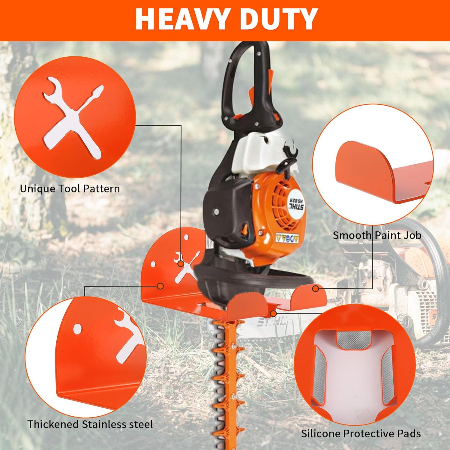 - [Heavy Duty] Proudly engineered by the Iulrtba design team in Troy, VA, our weed eater hanger brackets are constructed of 5/64" thickened 12 gauge stainless steel, which can handle up to 200 lbs and give you total confidence that your equipment is firmly stored. Each wall mounted grass trimmer rack is powder coated in durable orange paint, which perfectly matches the color scheme of Stiehl tools. The silicone pads protect your items from scratching or damage when rubbing up against the hook