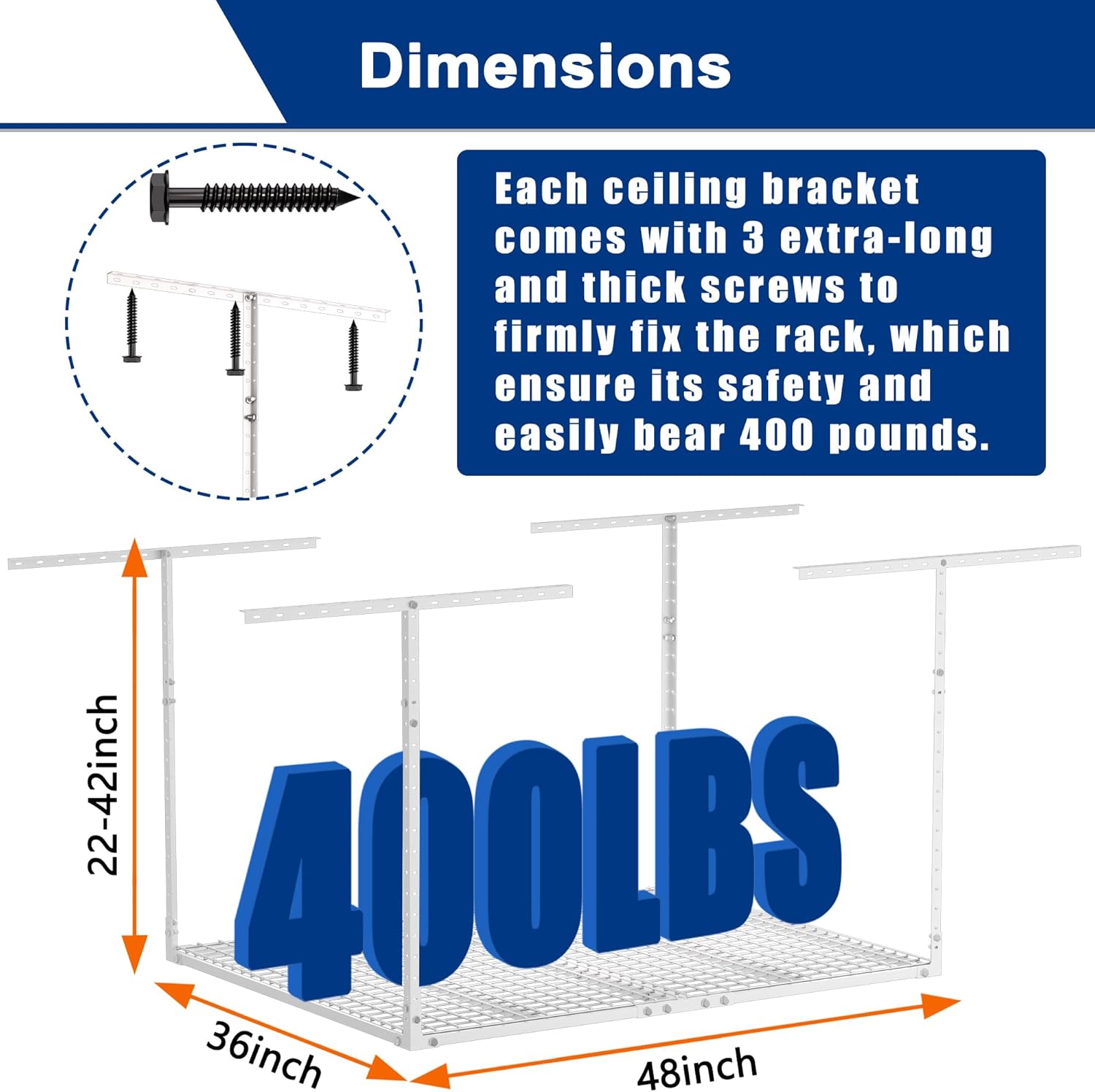 GIOTORENT 3x4FT Heavy Duty Overhead Garage Storage Rack - Adjustable Ceiling Shelving with 450lbs Weight Capacity, Metal Garage Organization System, White