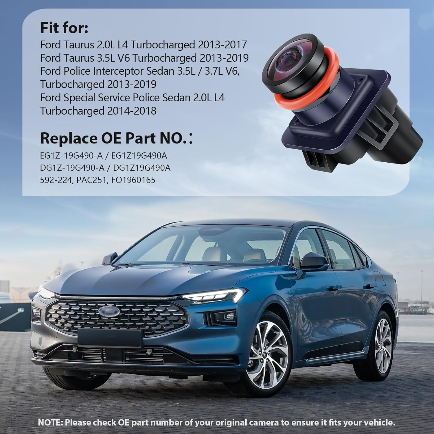- Replaces OE Part Numbers: The Ford Taurus reversing camera is compatible with the following OE numbers: EG1Z-19G490-A, EG1Z19G490A, DG1Z-19G490-A, DG1Z19G490A, 592-224, PAC251 and FO1960165. Please verify that your original cameraβs OE number matches any of the above