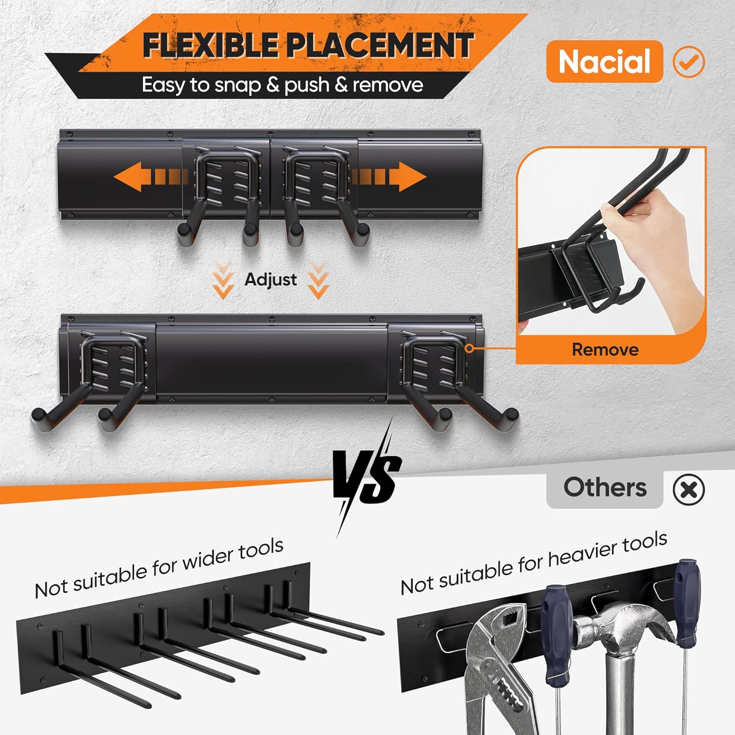 - 32-Inch Adjustable Garage Wall Tool Rack – Nacial Garage Tool Organizer Wall Mount includes 2*16" rails, 6 hooks, and 2 extension cord storage straps. The 32-inch wall-mounted rack allows for flexible tool organization, with hooks that snap onto the rail and can be easily repositioned to accommodate tools of all sizes. Ideal for your garage, utility room, workshop, or basement. Elevate Your Organization—Get Your Nacial Garage Tool Organizer Today!