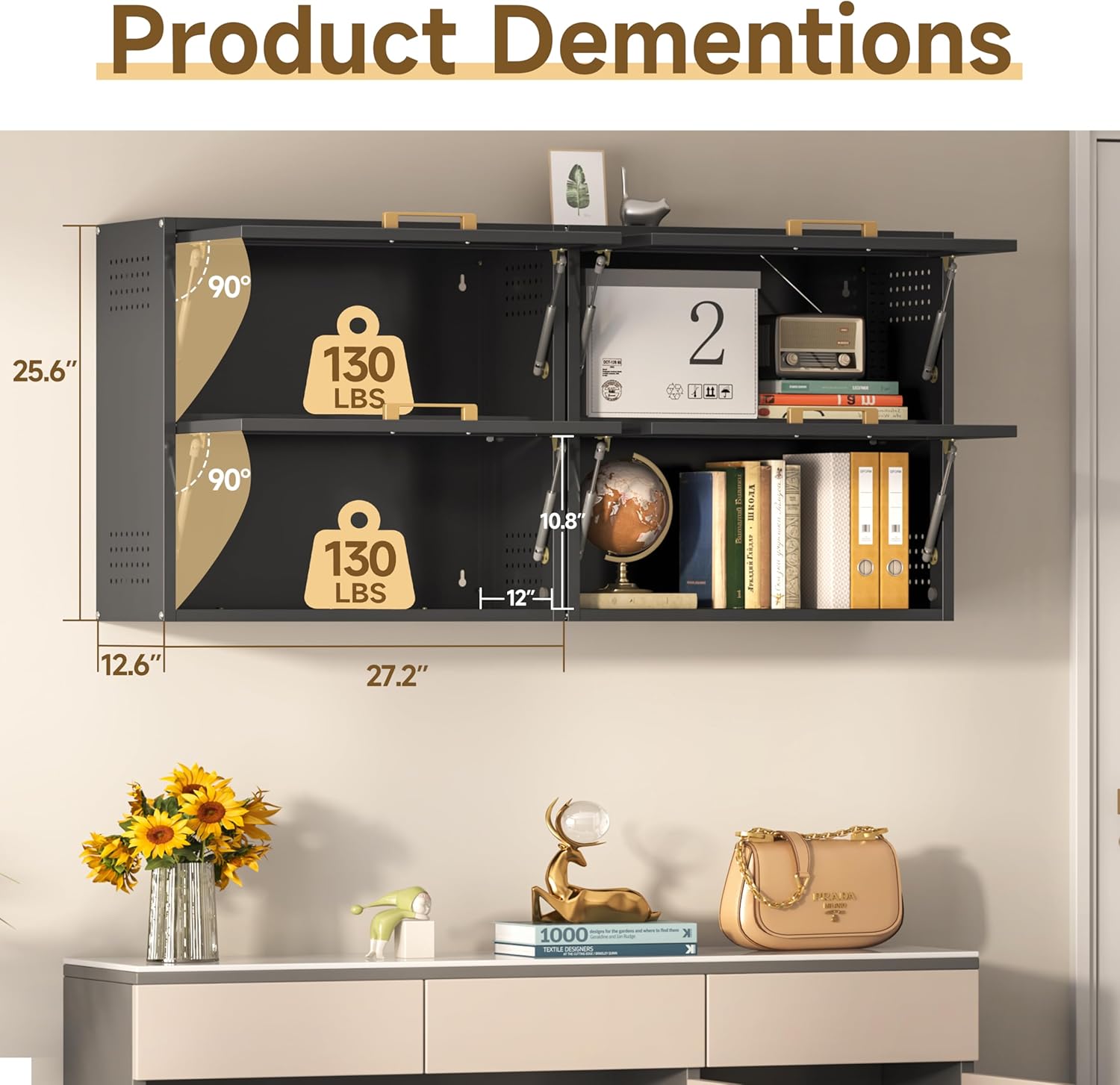 Metal Wall Cabinets with 2 Up-Flip Doors, Floating Steel Wall Mounted for Garage, Basement, Home Office, Kitchen, Warehouse - Black