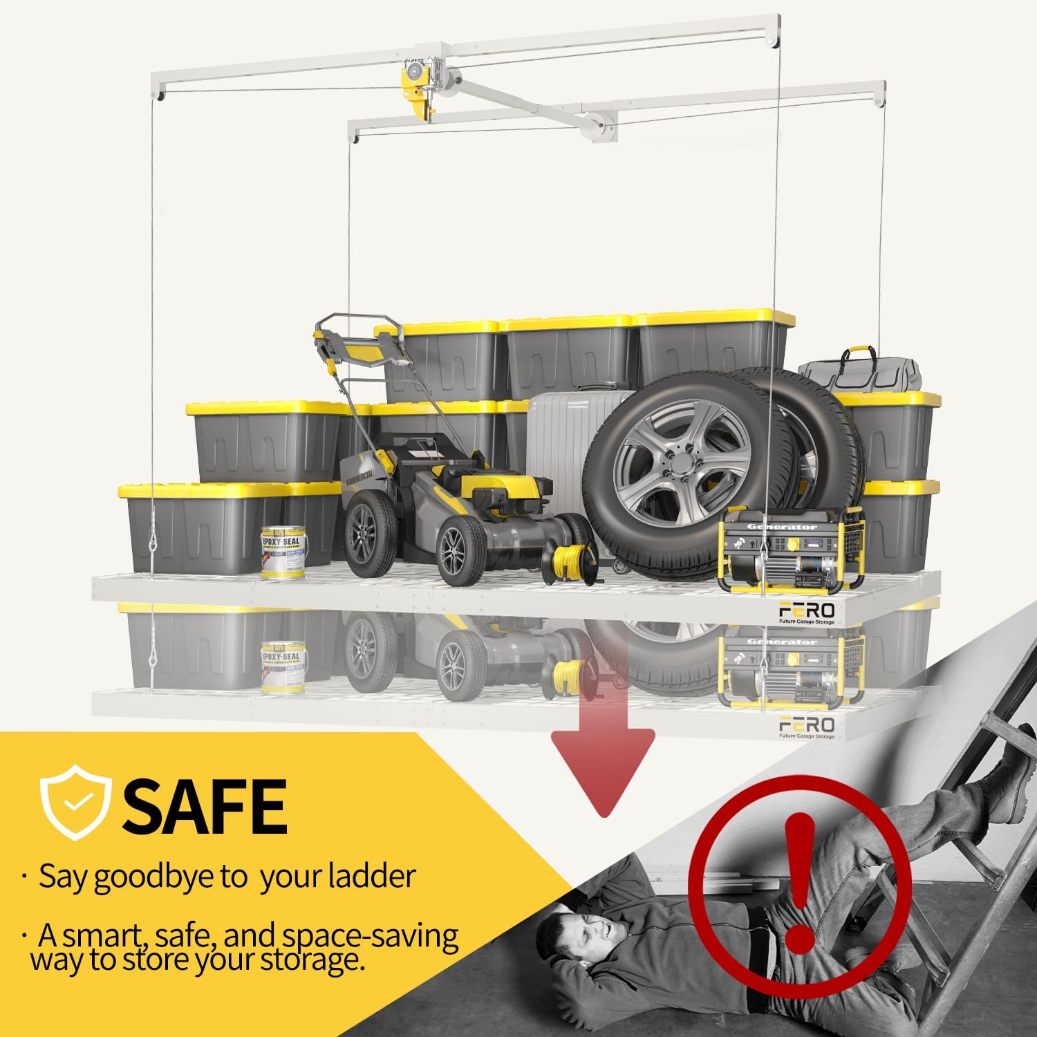 - Classic Design, Structurally Stable: FERO garage ceiling storage racks feature a classic H-shaped steel frame tested for over a decade, offering enhanced stability and durability compared to common four-point overhead garage storage rack designs. A manual safety lock adds extra security during use.
