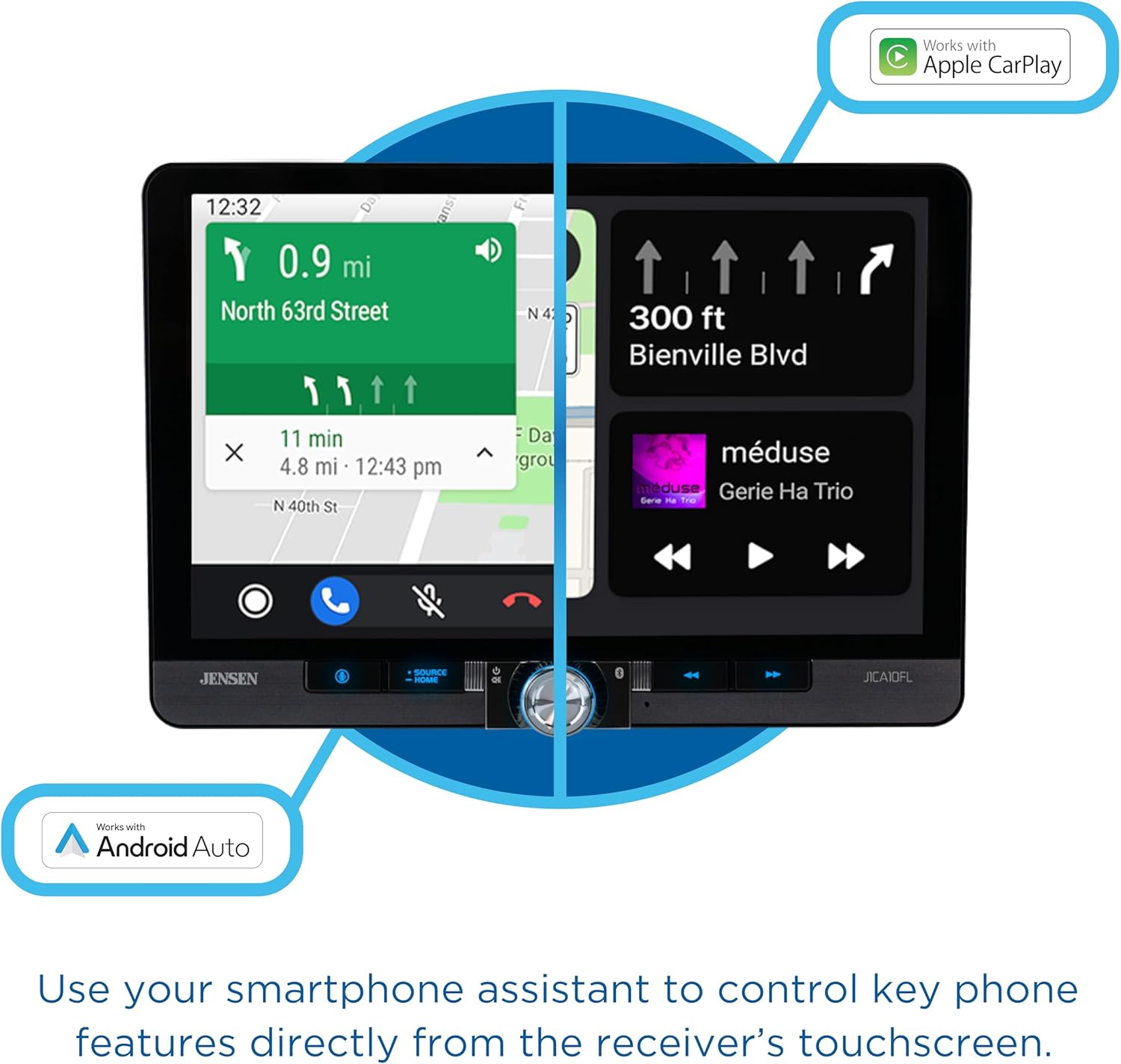 Jensen J1CA10FL-BUC 10.1-inch CarPlay Android Auto Car Stereo with Backup Camera and Additional Camera for Front of Car