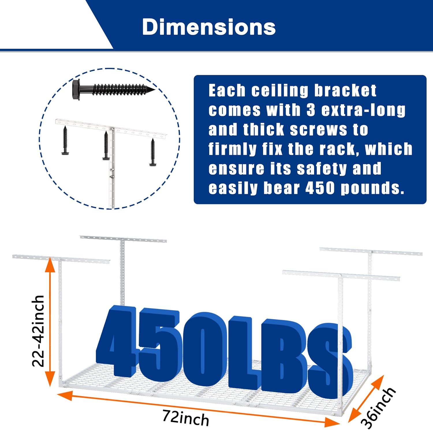 GIOTORENT 3x6FT Heavy Duty Overhead Garage Storage Rack - Adjustable Ceiling Shelving with 520lbs Weight Capacity, Metal Garage Organization System, White