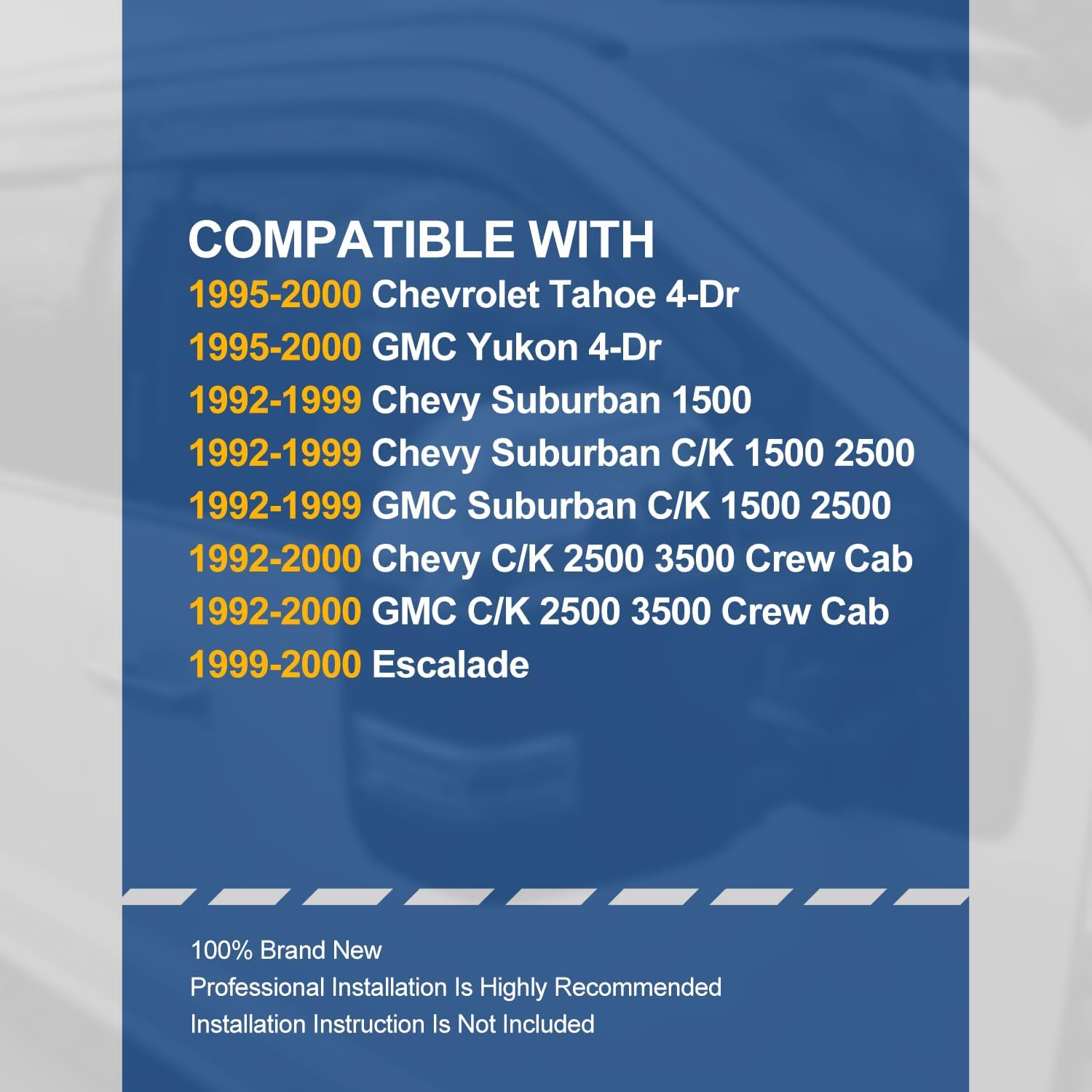 - Material Acrylic : Vehicle Service Type Compatible with Chevy Tahoe GMC Yukon 92-00