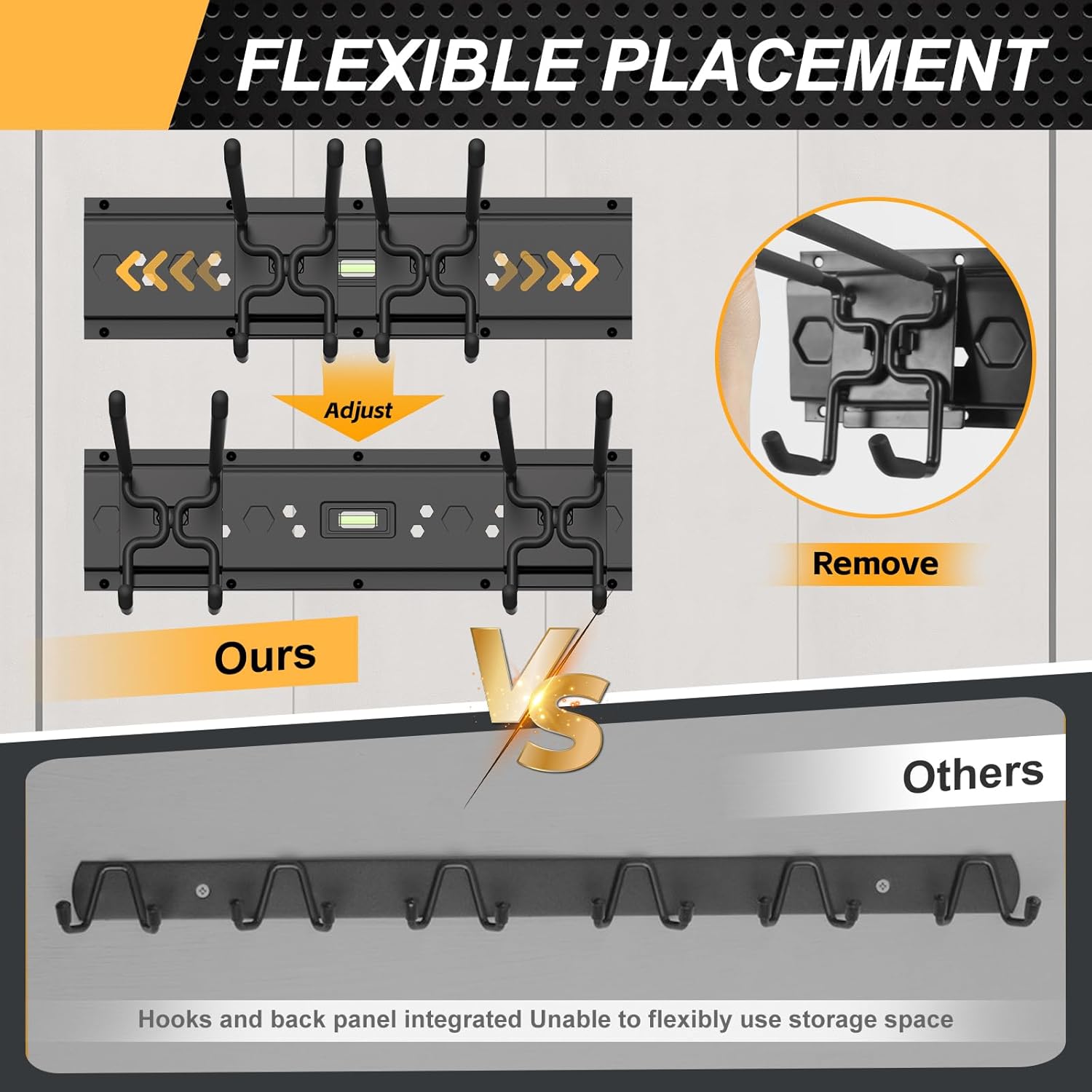 - Flexible and Adjustable Wall Mount Garage Tool Organizer: Equipped with three 16-inch steel rails that can be spliced into a total length of 48 inches, with 7 types of removable hooks (single-layer hooks, double-layer hooks, S-shaped hooks). The hooks can be freely adjusted to meet your different storage needs at any time. No matter how the types of tools change, the storage remains orderly, allowing you to control each tool's location easily