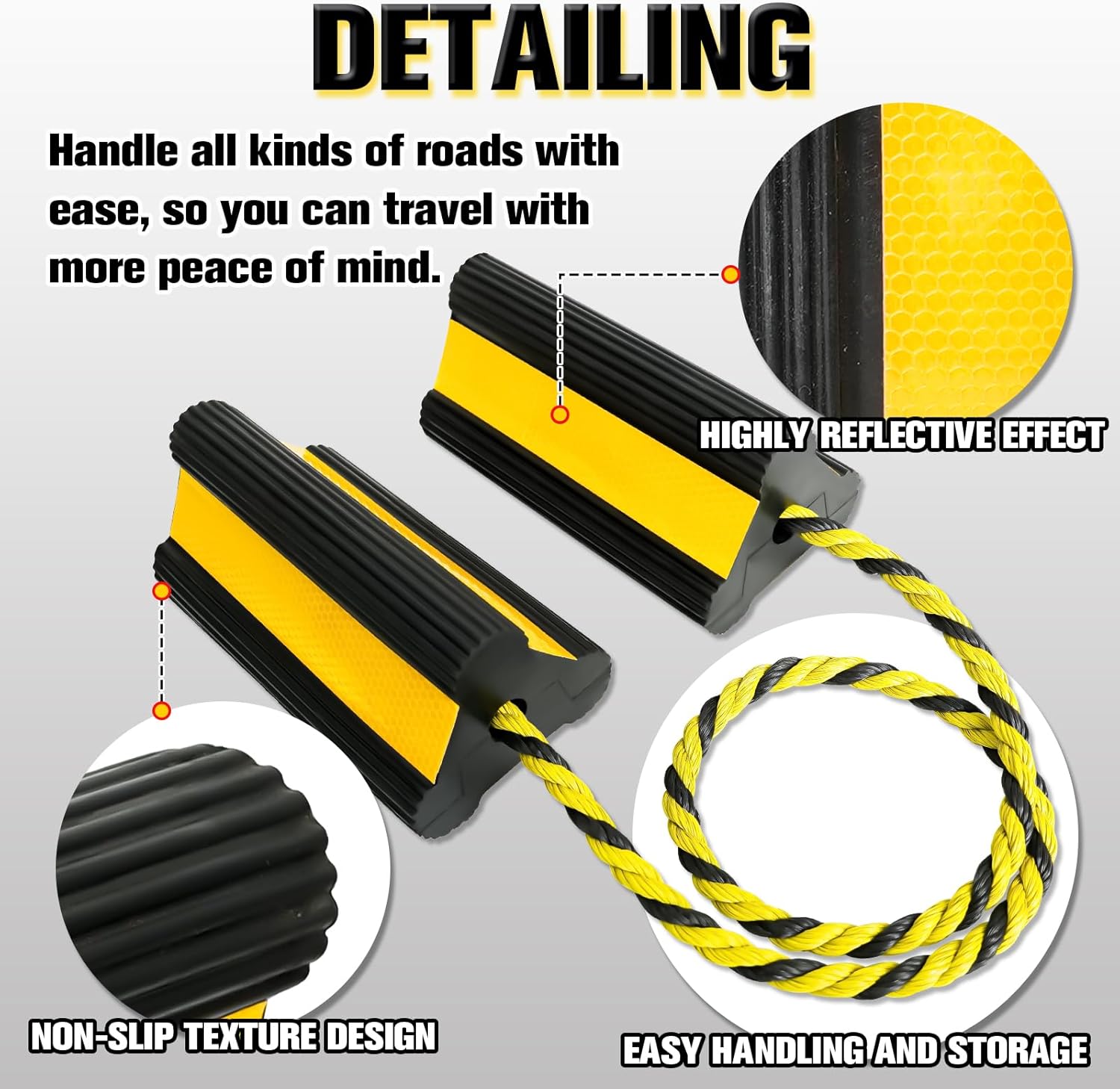 Heavy-Duty Wheel Chocks with Extra-Long Safety Rope (86") - 2-Pack Reflective Rubber Blocks for Trailers, Trucks, Campers & Garage Use (4pair/8pack with Rope)