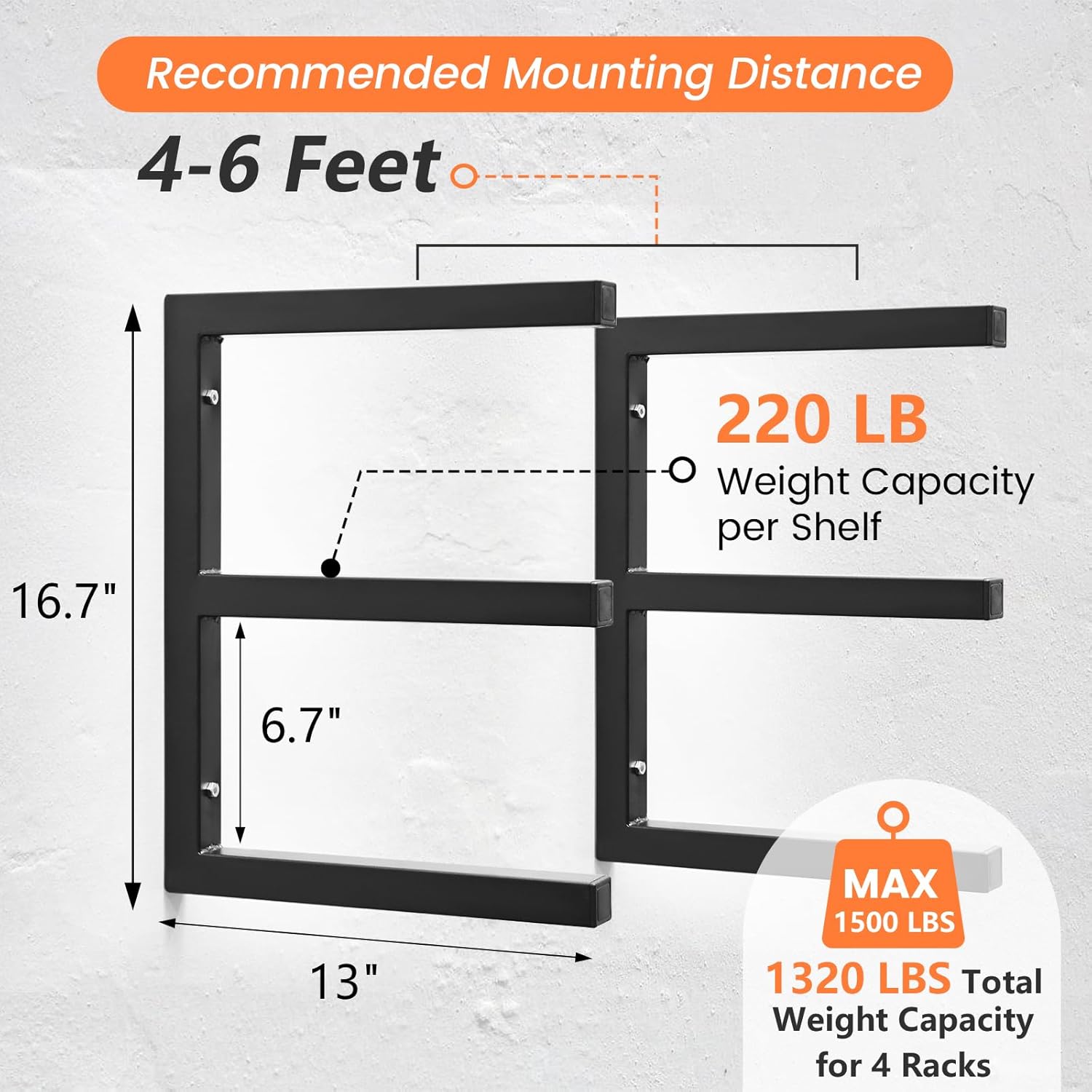 - [Heavy Duty Lumber Storage Rack]: Our wood storage shelves can be mounted on a variety of wall materials, such as concrete walls, wooden walls, red brick walls, etc. Two racks in a group, each shelf can hold 220 pounds, a total of 1,320 pounds, the load capacity is excellent, can meet your daily needs.