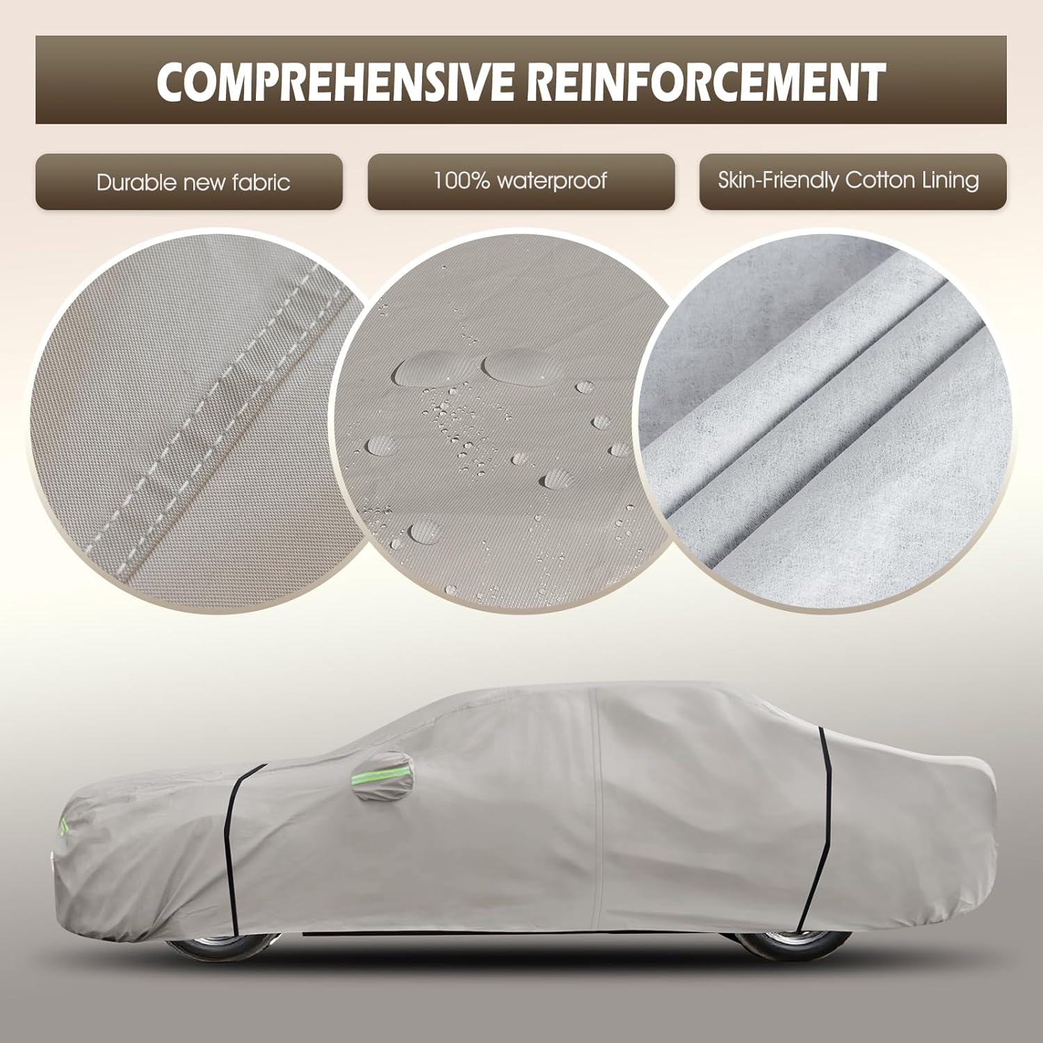 - High-Quality Material: Migaven car cover features a multi-layer composite material design. Layer 1 is PA coating, providing 100% waterproofing. Layers 2 consist of PE, enhancing breathability and maintaining suitable interior temperatures. Layer 3 is an aluminum membrane that reflects 99% of UV rays, reducing UV damage. Layers 4-5 are PEVA material, with strong tear resistance to maintain integrity in harsh weather. Layer 6 is soft cotton, effectively safeguarding the car's paint.