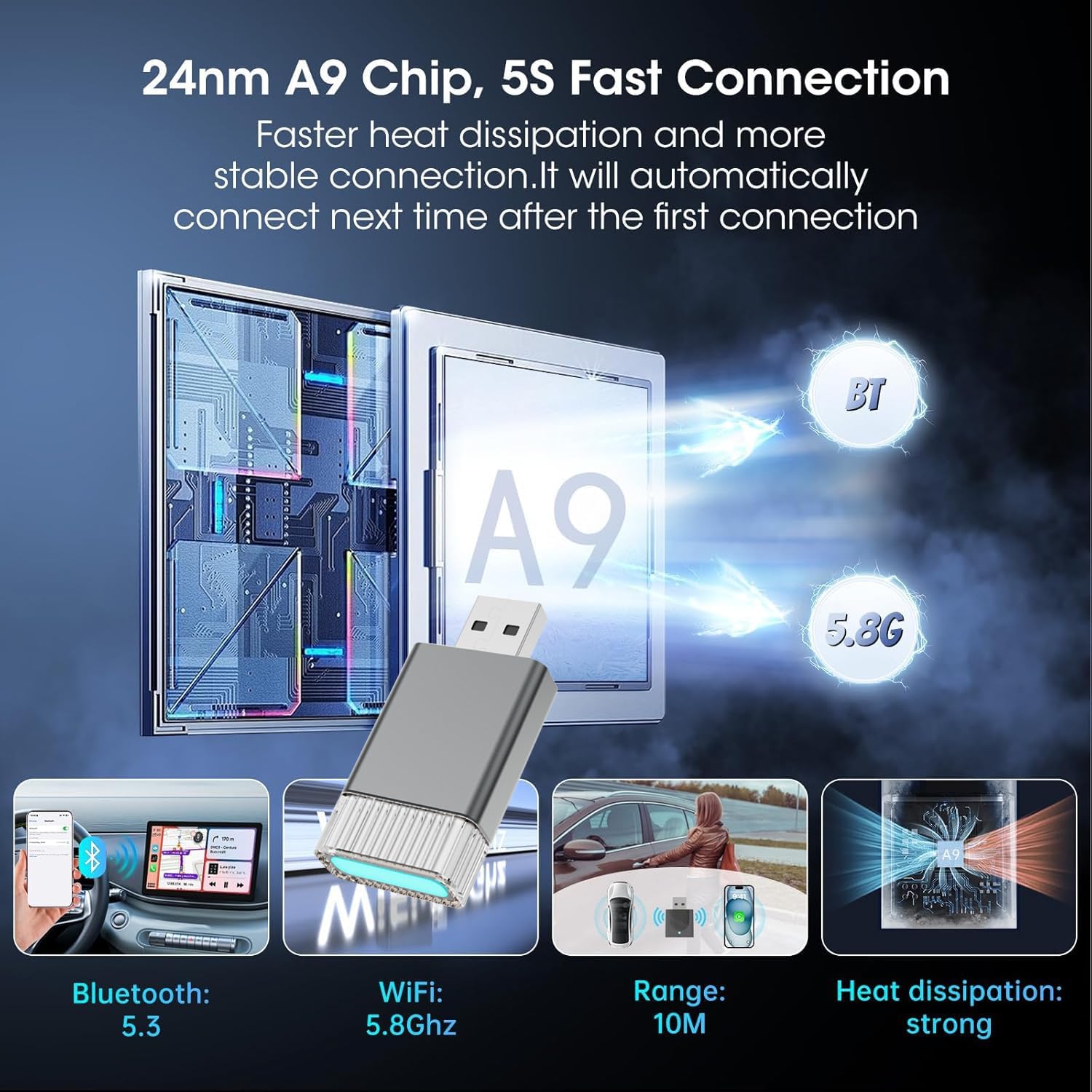 - PLUG/PLAY EASY SETUP & AUTO-RECONNECT: No need apps or software electronics,Complete the first connect in 10seconds and auto reconnect in 3seconds (Bluetooth + Wifi). Experience transmission speeds 5times faster than other adapters.This stable car play eliminates the frustration of connection drops and ensures quick response times and zero delays low Latency.