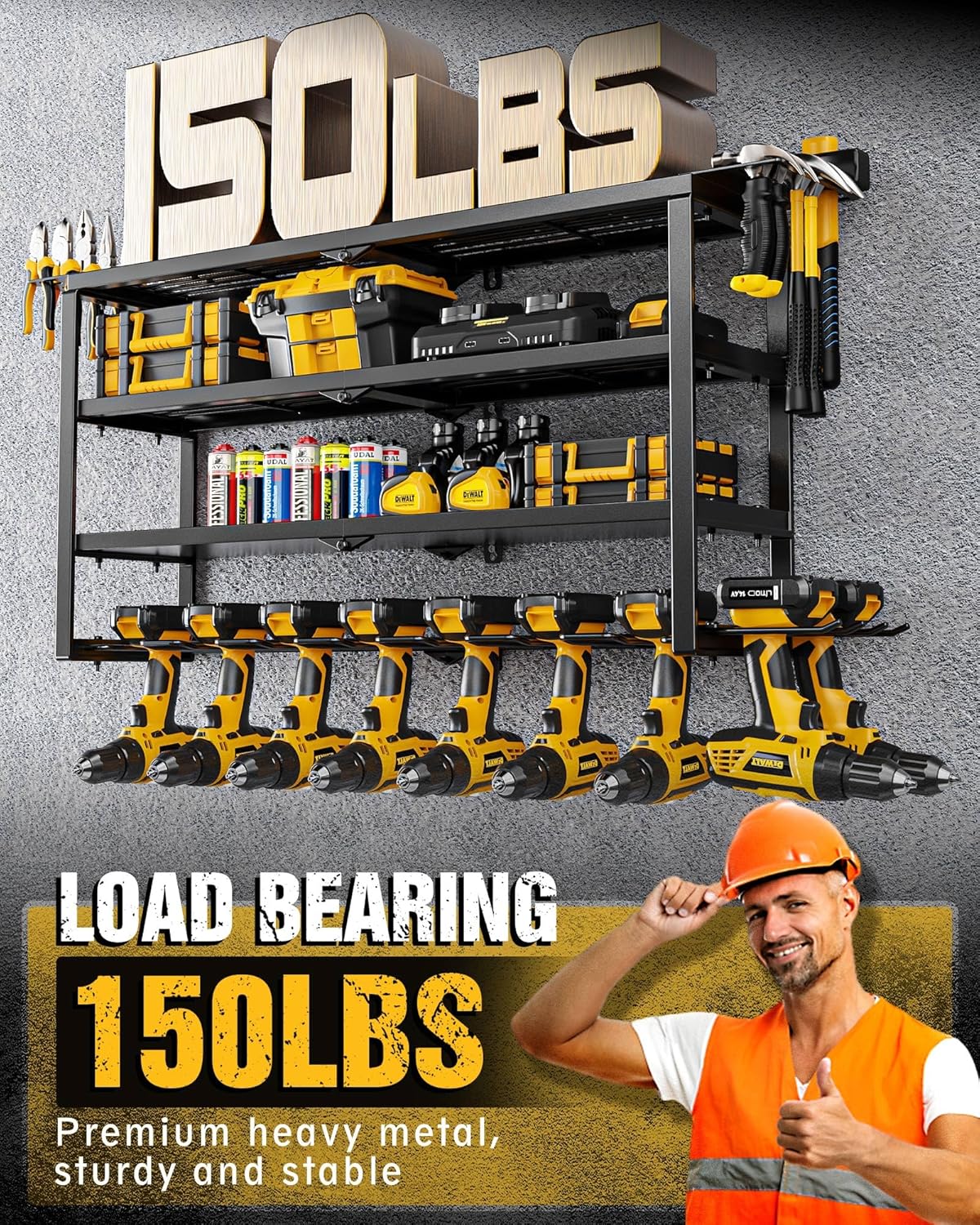 - UPGRADED DESIGN: The bottom shelf holds 7 drills, with additional 1 multi-function hook on the side to store up to 2 more drill or shovels, brooms, and cords. It's perfect suit for DeWalt/ Milwaukee/ Ryobi tools, make your space more neat and organized