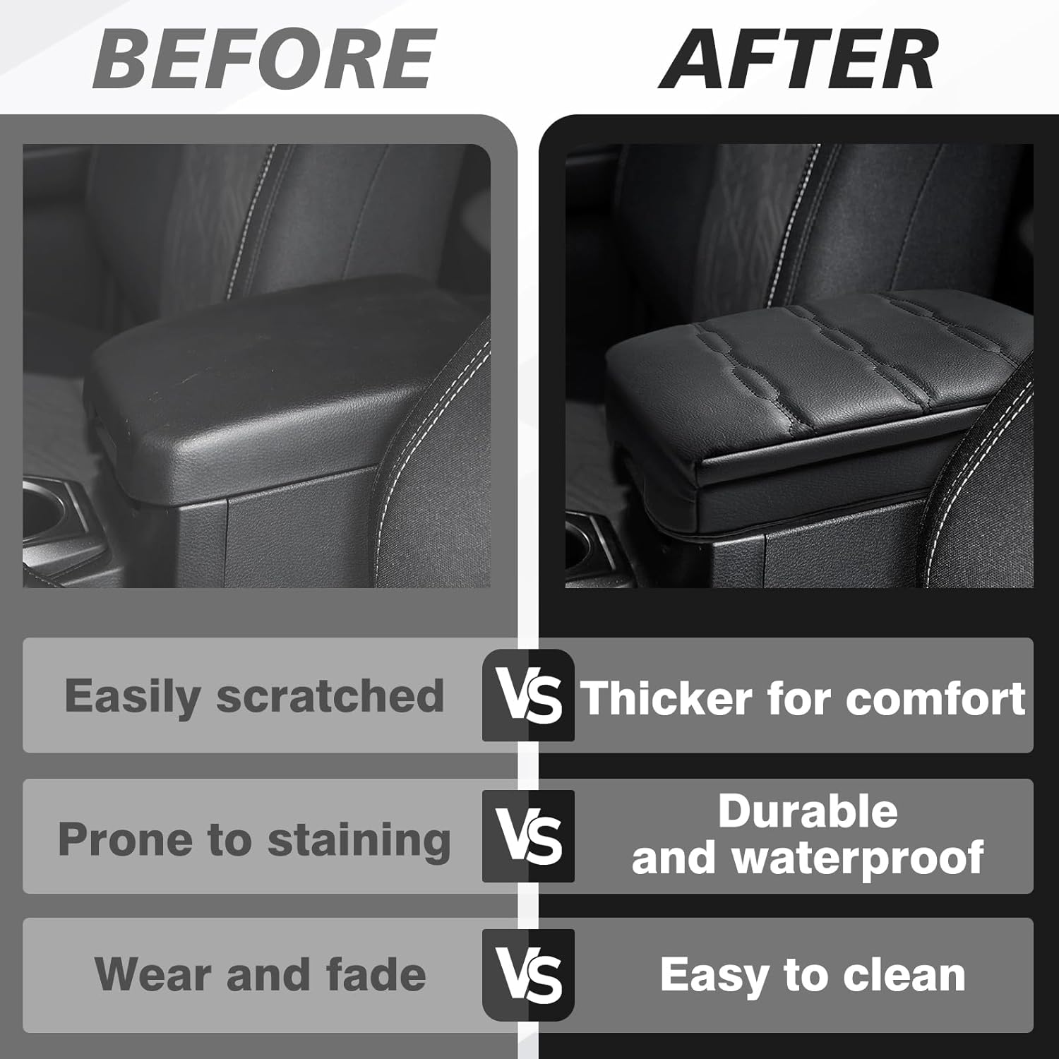 - Unique Design: Designed according to the OEM element to make it match your vehicle perfectly and even better. Our armrest cover is crafted with high-quality Vegan Leather and an extra layer of foam, which is skin-friendly, breathable and soft.