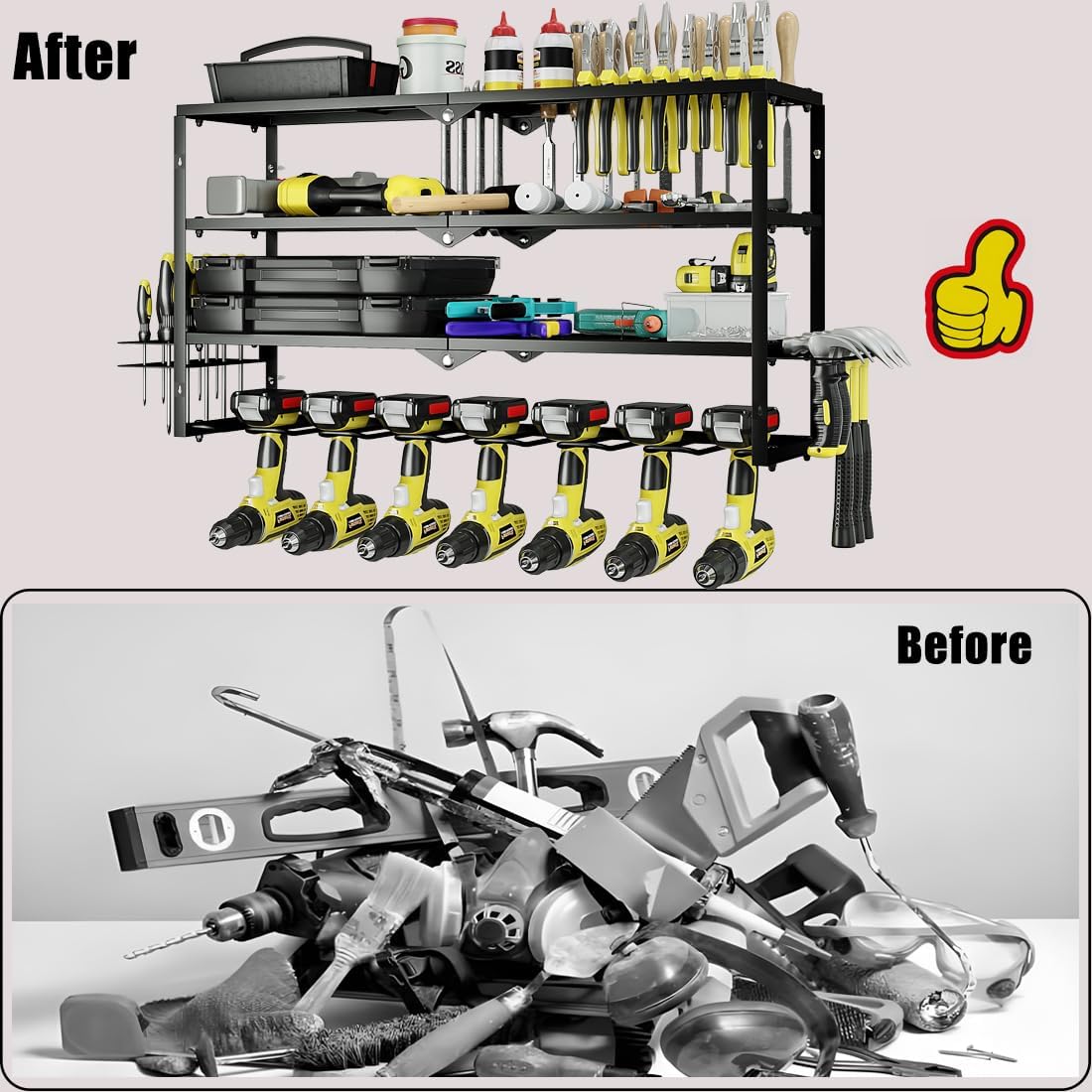 - Large Size: Your ultimate tool mate! 7 drill slots + 3-tier shelves & dual hooks organize all tools in one spot. Never waste time searching โ enjoy a clean workspace that boosts efficiency!