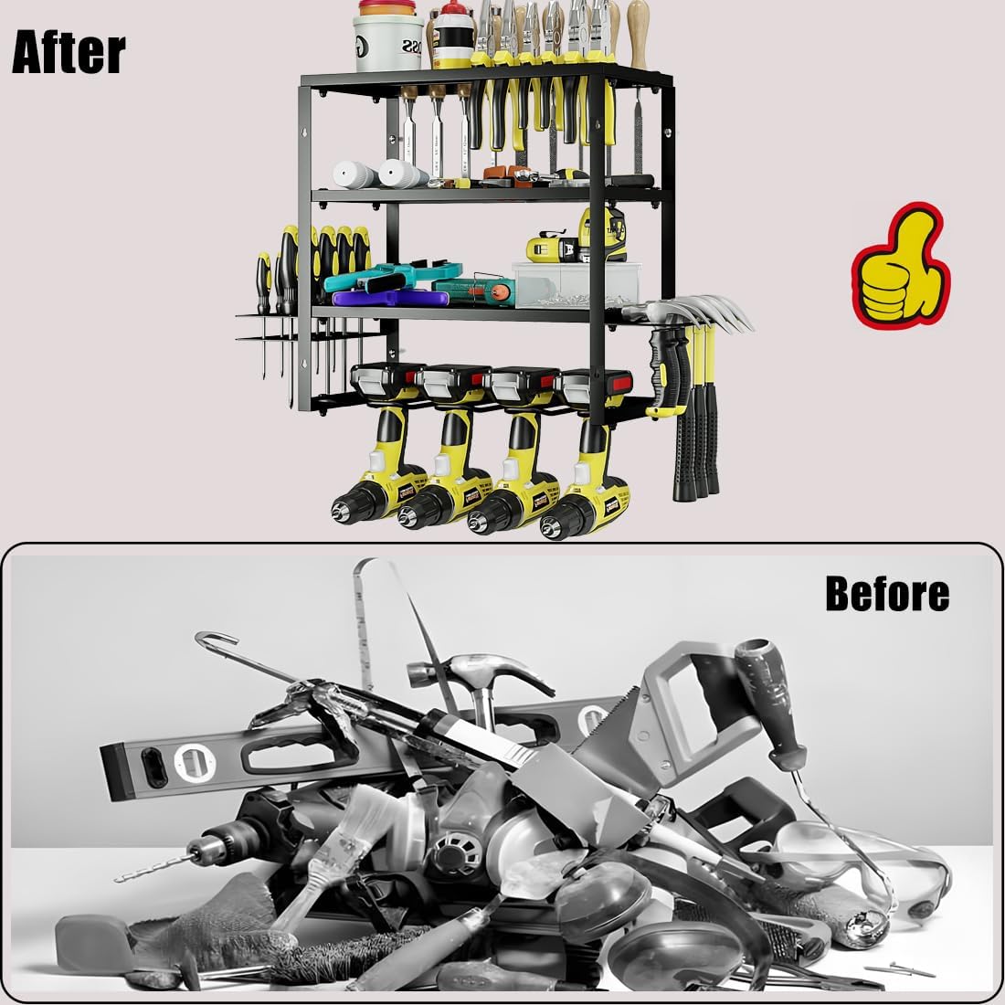 - Large Size: Your ultimate tool mate! 4 drill slots + 3-tier shelves & dual hooks organize all tools in one spot. Never waste time searching โ enjoy a clean workspace that boosts efficiency!