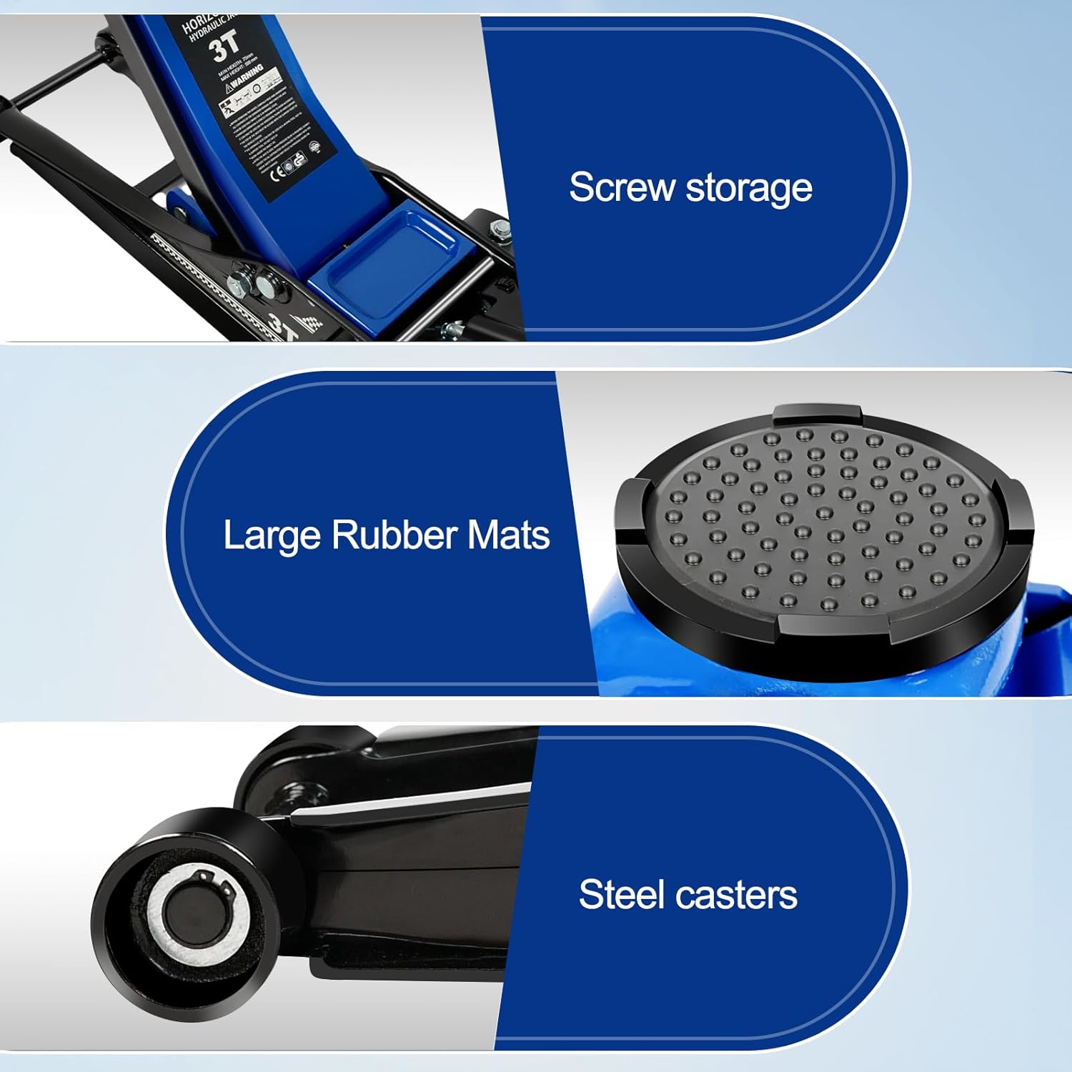 - 【Ultra Low Profile Jack】: Lifting range 2.95"-19.69" for ultra low profile models. It adopts dual pump system to provide you with efficient work. And meet the needs of your family car,truck,suv,van various models.