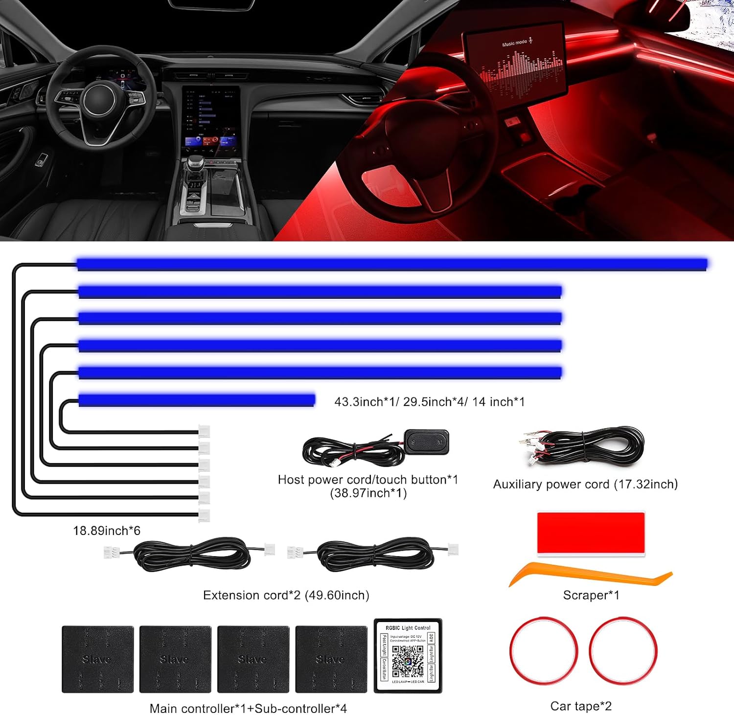 - ăHigh Bright & UniformăThe RGB Acrylic LED Car Ambient Interior Lighting have super bright LED and acrylic lens and contains 6 LED strips (4*29.5inch+1*43.3inch+1*14inch), also comes with 1 main controller and 4 sub controllers,and can be flexibly installed on any car by DIY without disorganized, which is plug and play, and this acrylic light evenly spread over the lamp strip is brighter, more uniform and softer than other optical fiber lamps that rely on only one LED.