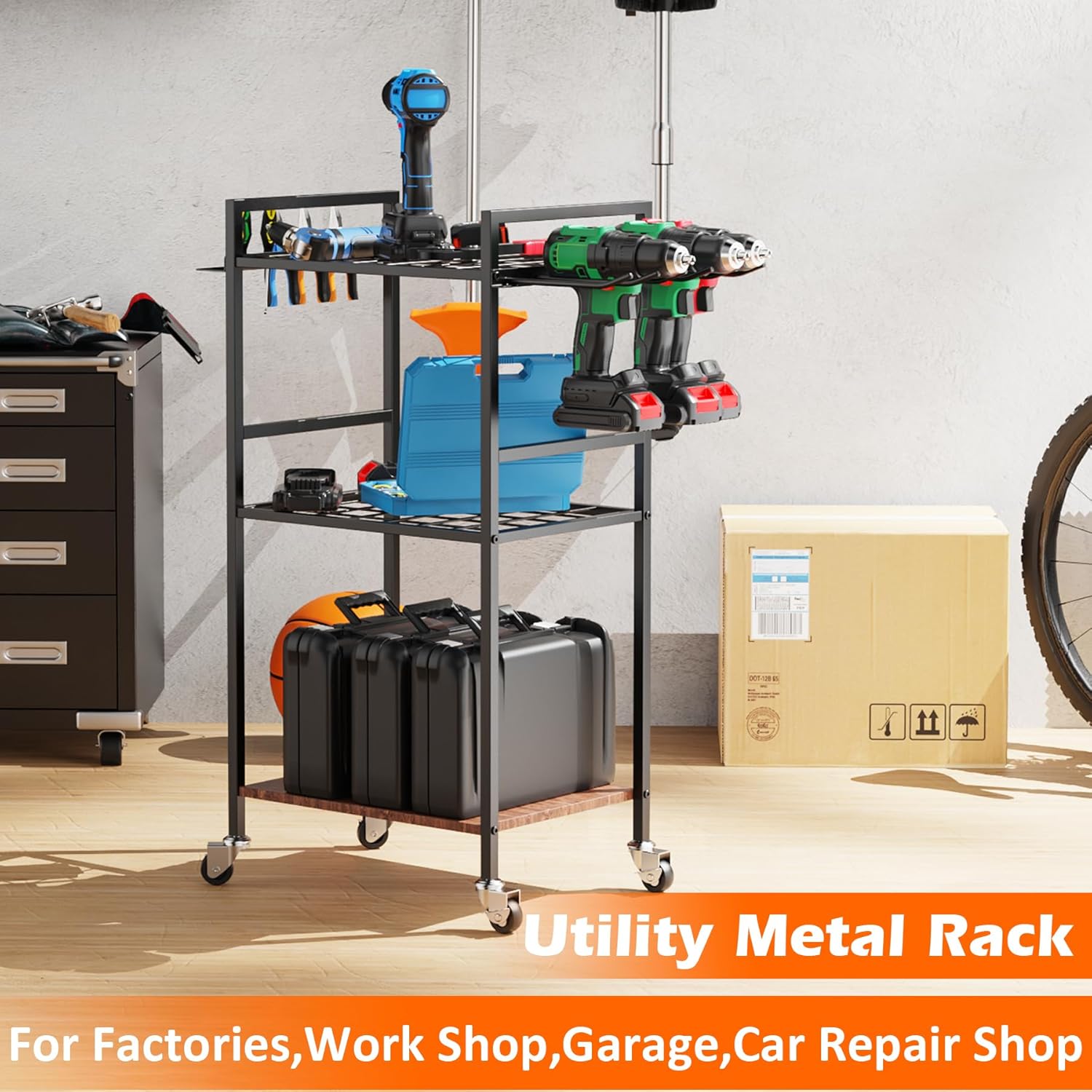 - Rolling Metal Tool Stand: Equipped with 360° wheels, making it easy to move around the garage or workshop. The wheels are designed to be sturdy and durable, allowing the cart to be moved with ease, and making it easier to access handy tools and equipment