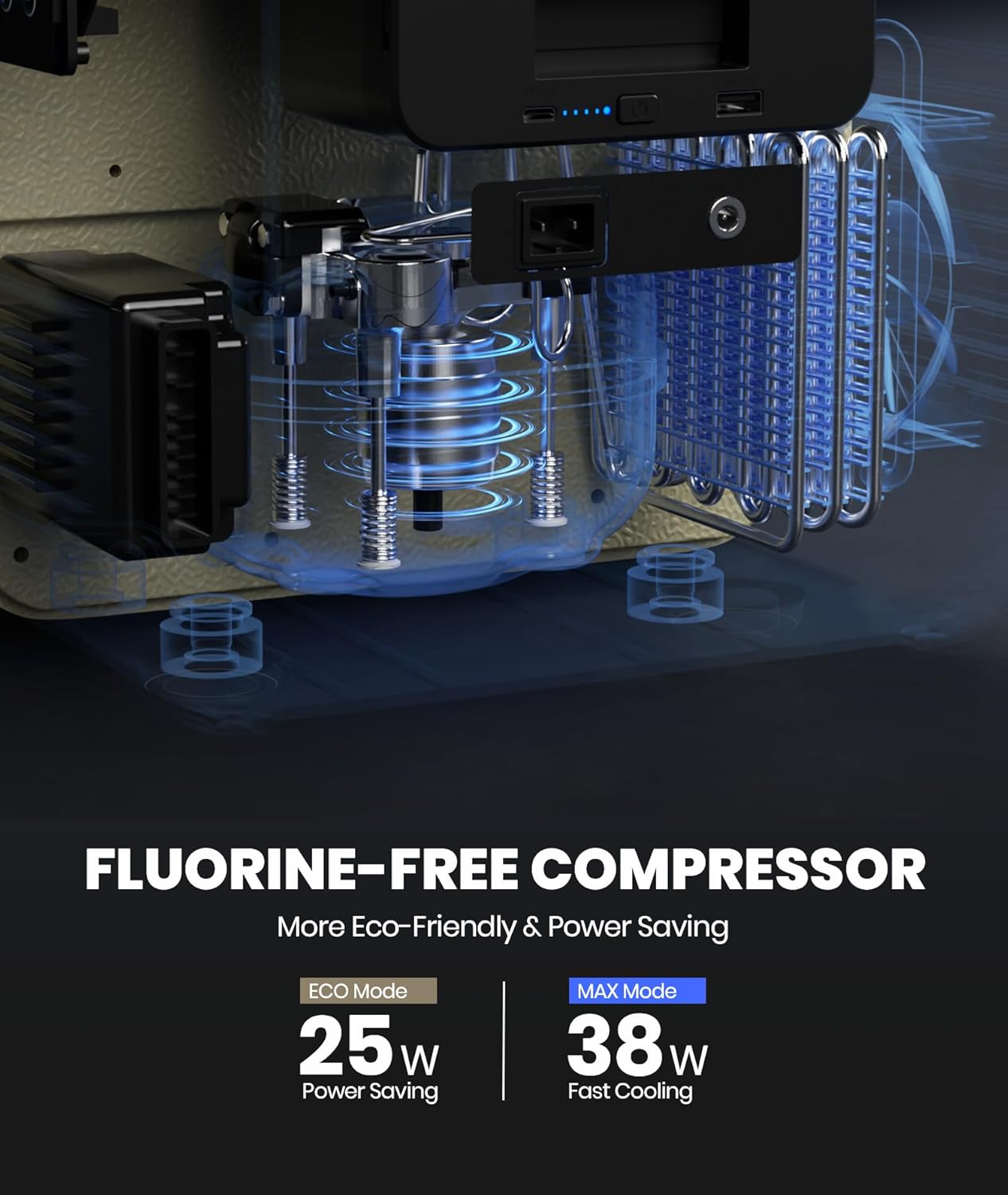 - 38W Ultra-Efficient Cooling:Choose between MAX mode (38W) for rapid cooling or ECO mode (25W) for energy savings. Even in MAX mode, it uses less than 0.5 kWh/day – one of the most efficient 12V fridges on the market. Pair it with a battery and solar panel for 24/7 cooling without electricity costs, saving you money in the long run