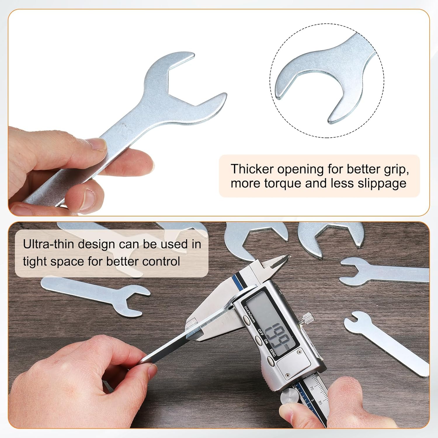 - Size - Open end: 28mm / 1.1"; Open outside width: 46.2mm / 1.82"; Total length: 135mm / 5.31"; Stem thickness: 2.8mm / 0.11"; Stem width: 17mm / 0.67"; Color: Silver-grey; Package includes: 10 x Single open-end wrenches. The open wrench set is thin enough to work on tight spots.