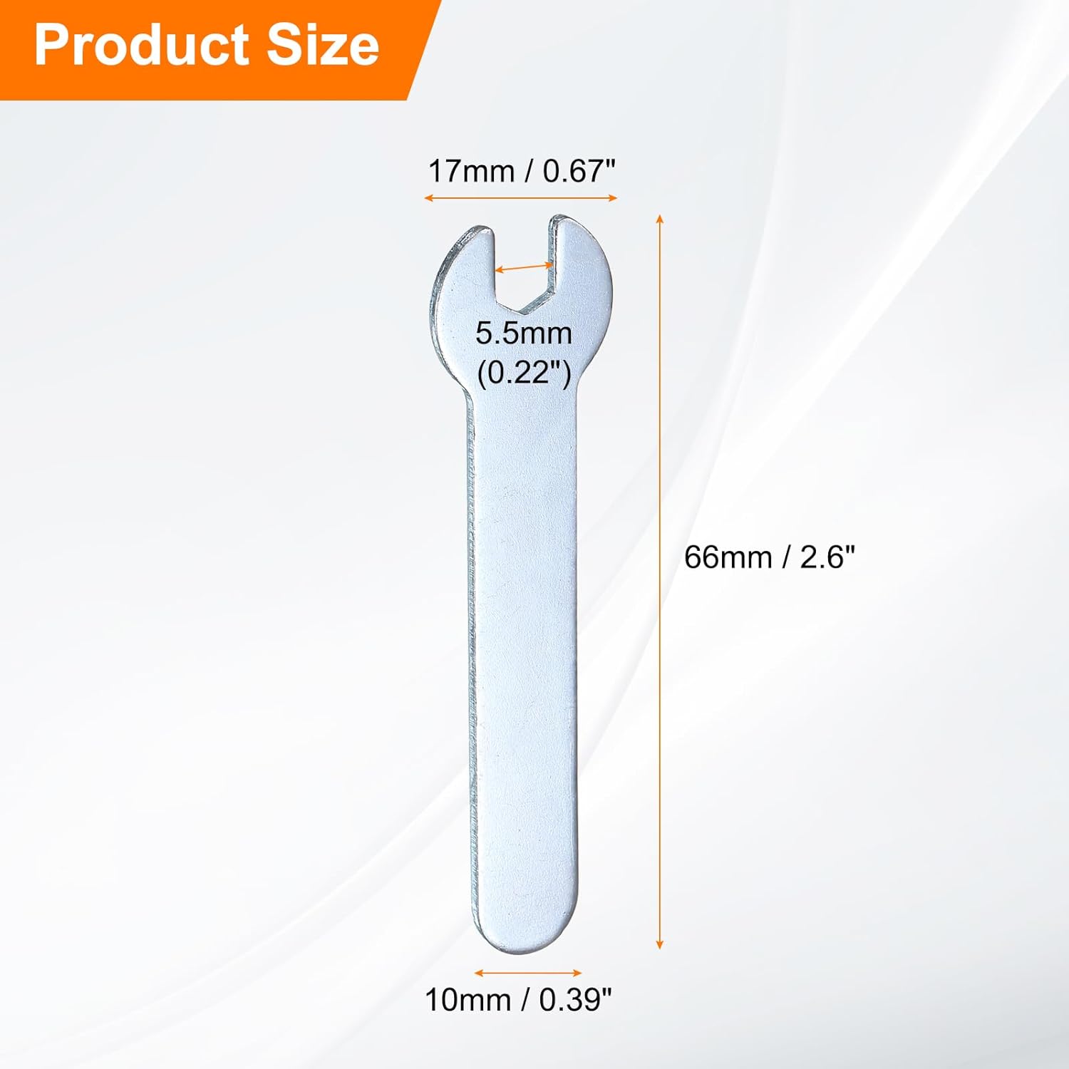 - Size - Open end: 5.5mm / 0.22"; Open outside width: 17mm / 0.67"; Total length: 66mm / 2.6"; Stem thickness: 1.5mm / 0.06"; Stem width: 10mm / 0.39"; Color: Silver-grey; Package includes: 10 x Single open-end wrenches. The open wrench set is thin enough to work on tight spots.