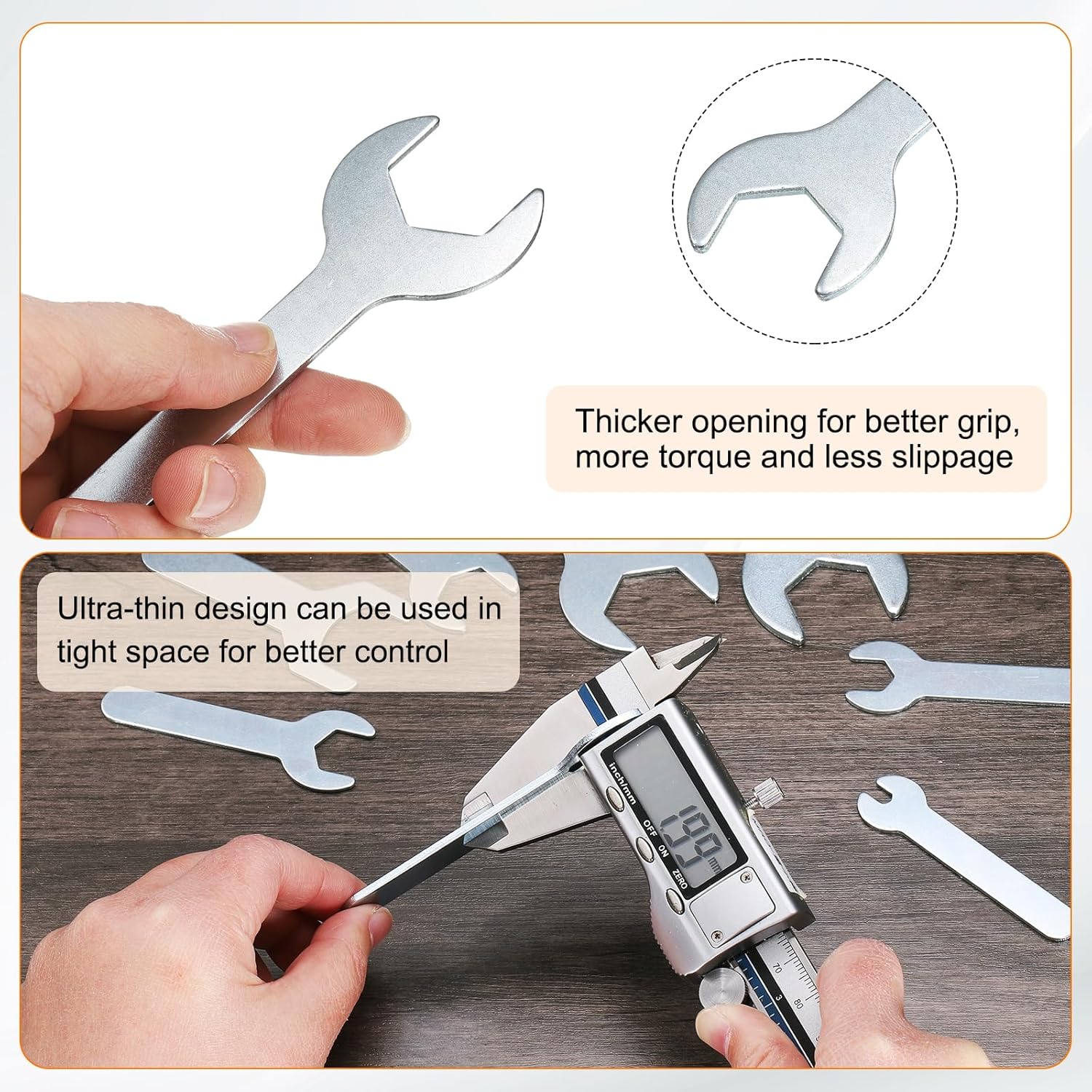 - Size - Open end: 25mm / 0.98"; Open outside width: 43.8mm / 1.72"; Total length: 126mm / 4.96"; Stem thickness: 2.8mm / 0.11"; Stem width: 16mm / 0.24"; Color: Silver-grey; Package includes: 10 x Single open-end wrenches. The open wrench set is thin enough to work on tight spots.