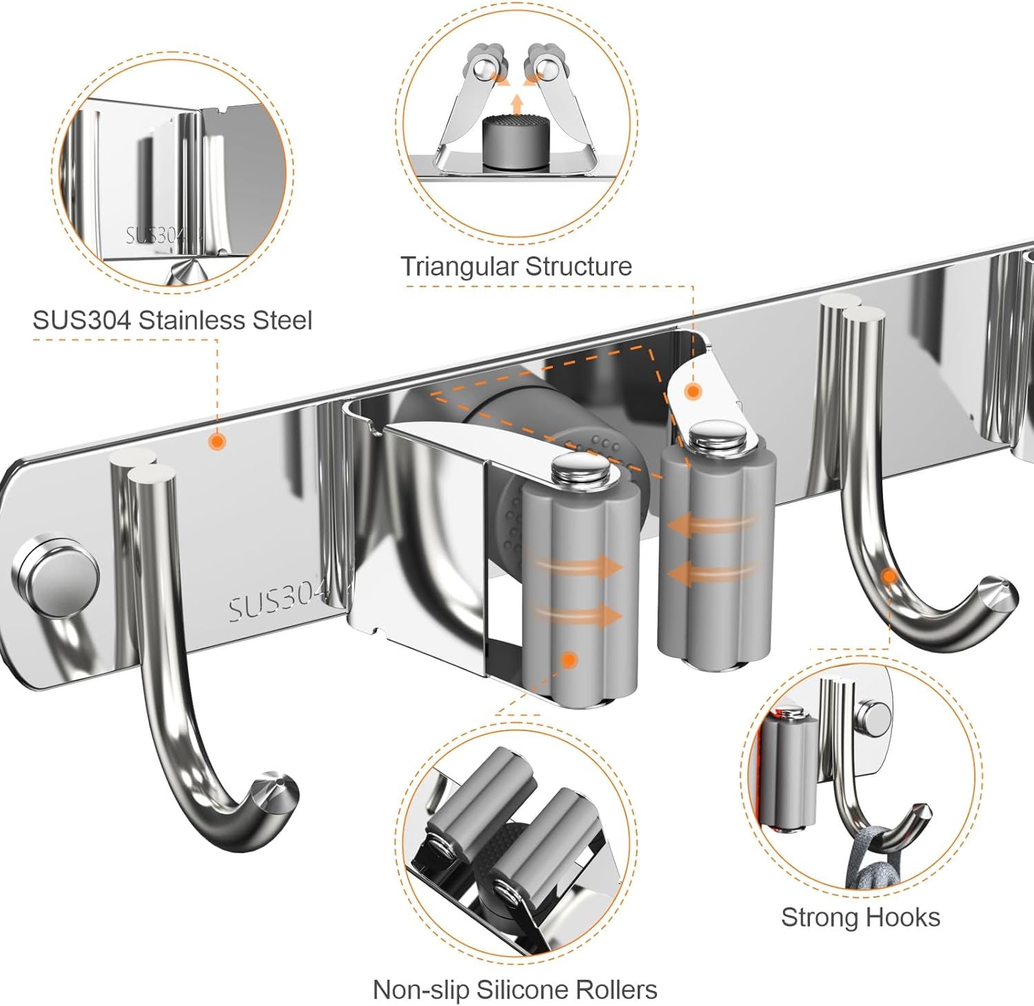 - STURDY AND FUNCTIONAL:The mop and broom holder wall mount is made of premium quality stainless steel, corrosion-resistant, rustproof and waterproof,wear-resistant, long-lasting and easy to clean