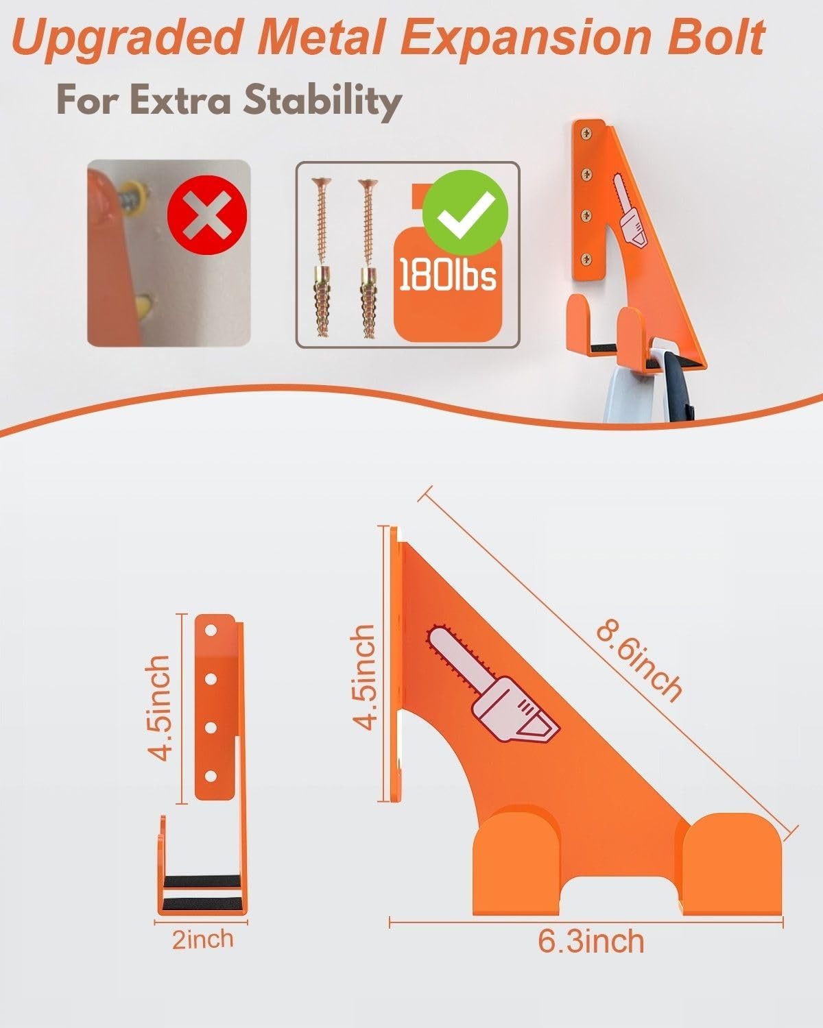 - đȘăHeavy Duty Alloy Steel Chainsaw HolderăBuilt with 3mm Alloy Steel (180LB load capacity), this chainsaw stand outperforms iron/plastic by 30% in weight-bearing. Heavy-duty metal expansion screws fit most walls with 3X stronger hold vs. plastic anchors.