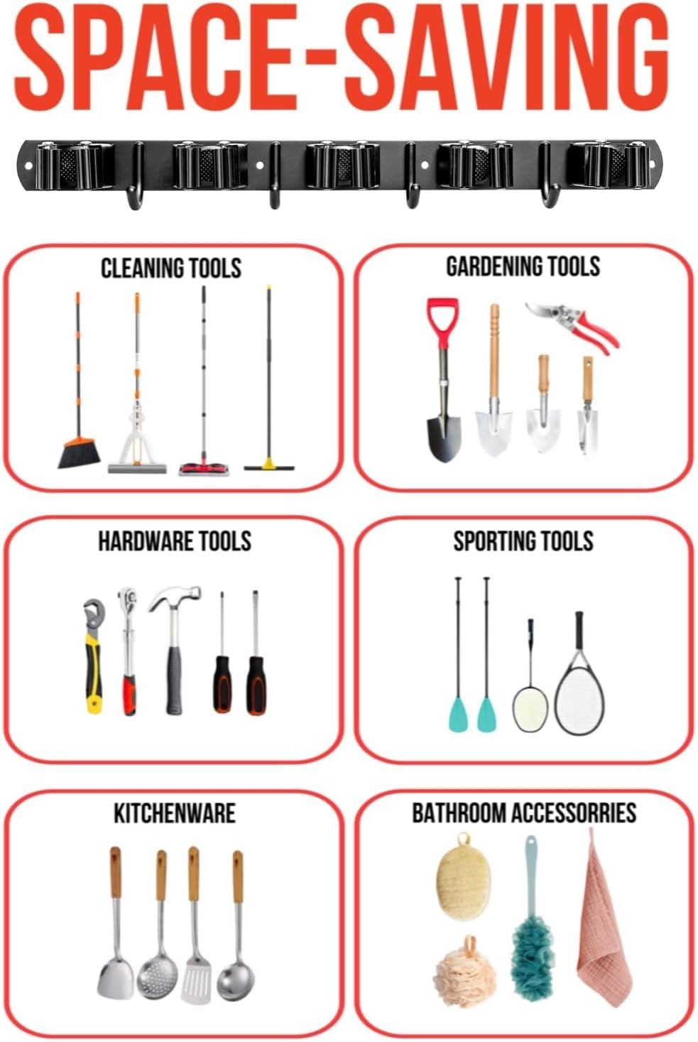 - VERSATILE STORAGE: Each holder features multiple slots and hooks to securely grip handles of different sizes for brooms, mops, rakes, and other tools
