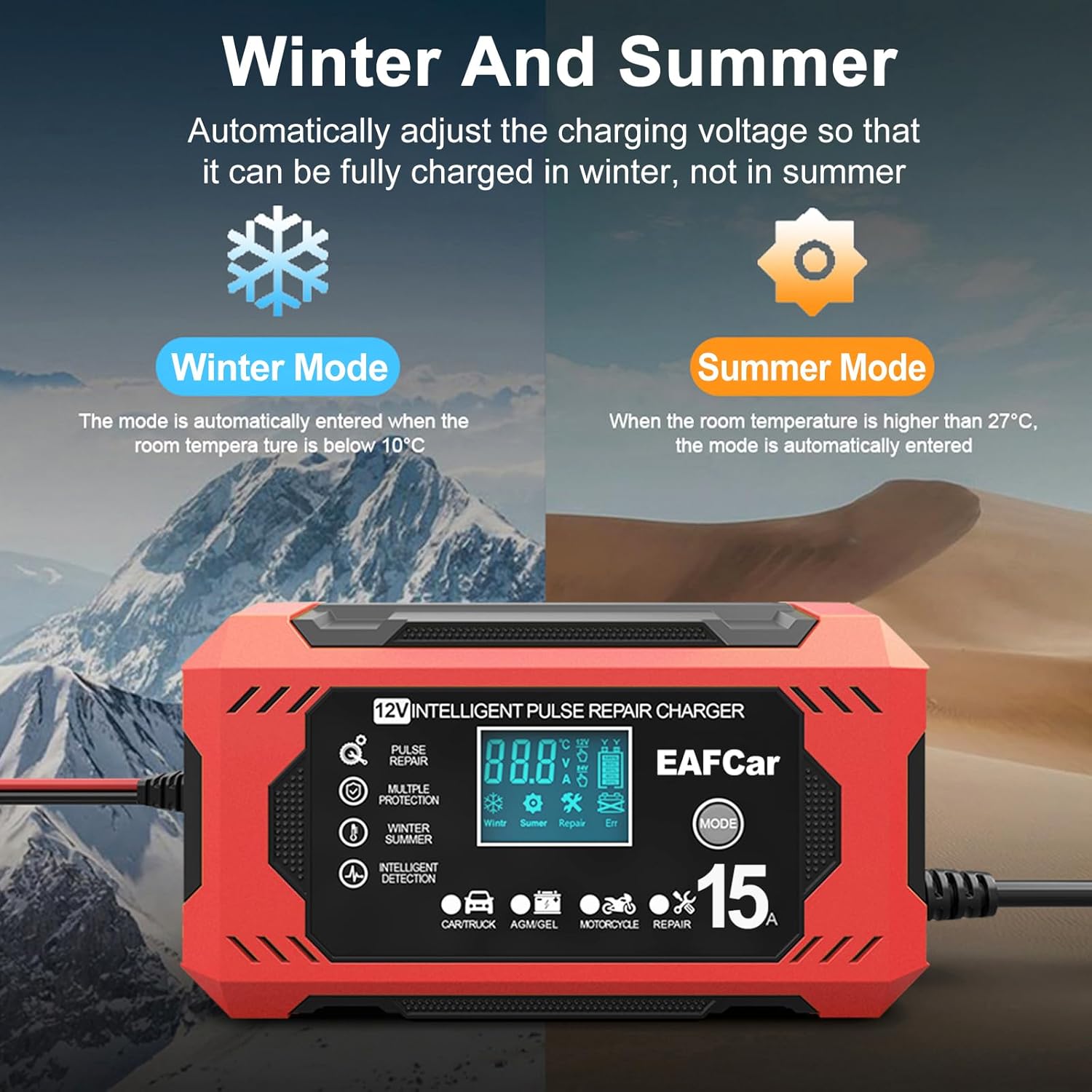 • 🔋【LARGE LCD DISPLAY VISUALIZED CHARGING】Just plug and play, leave the car battery charger booster there for charging and maintaining your batteries, automatically detect battery voltage, battery sulfation and acid stratification.The smart digital LCD screen of the auto battery charger displays the charging status and battery status.