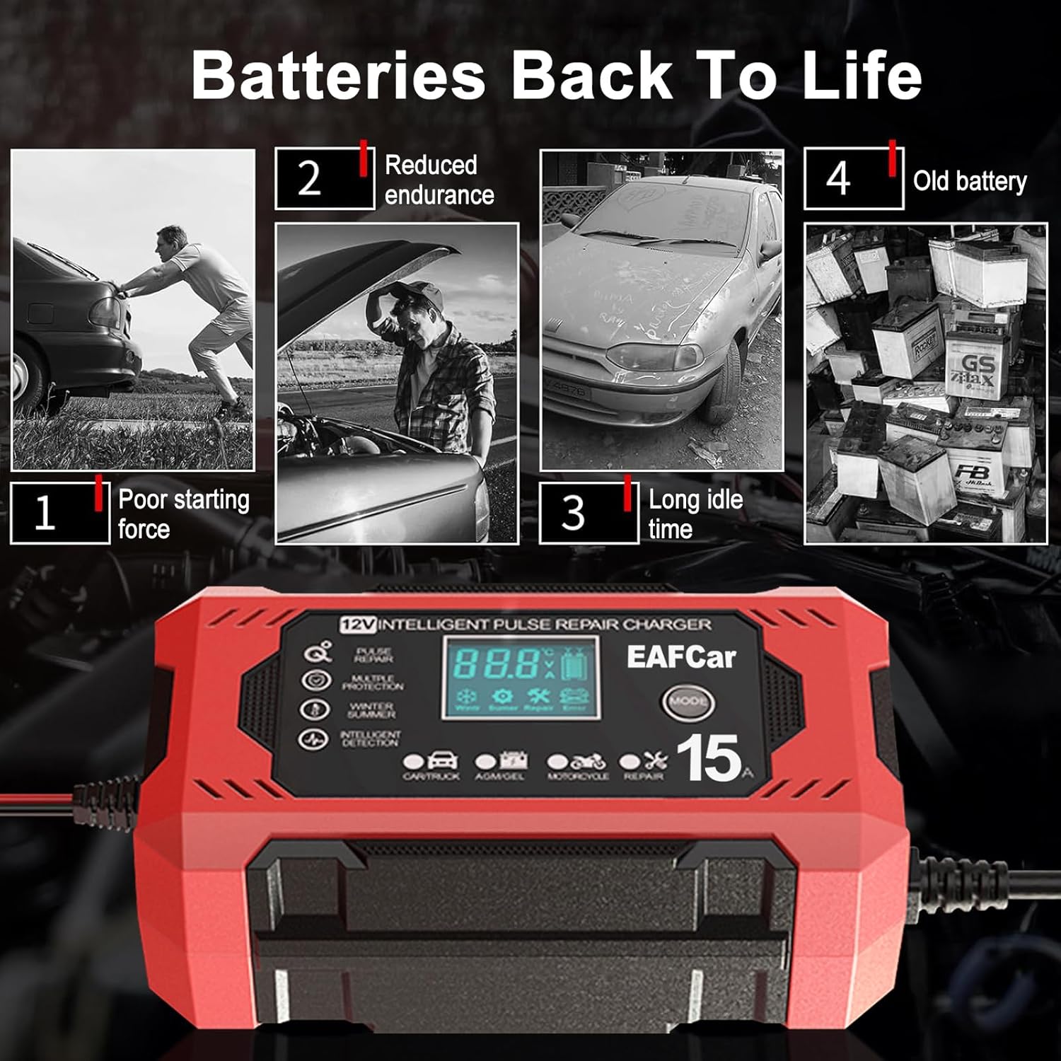 • 🔋【QUICK BATTERY CHARGER】12 volt 15-Amp quick car battery charger, can charge or repair all 12-volt lead-acid automotive, marine and deep-cycle batteries including AGM, GEL, SLA, Flooded in cars, trucks, SUVs, motorcycles, lawn mowers, boats, etc.