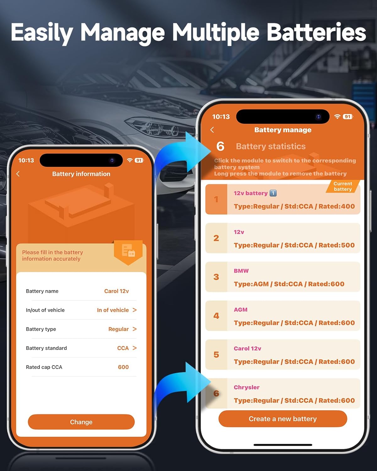 - Unique App Convenience - Enjoy wireless battery tester freedom with low-power Bluetooth (BLE Tech) that connects instantly up to 10 meters—test right from the driver’s seat without moving around. The built-in Quick Start Guide walks you through each step with visual guidance, making battery testing simple and stress free. Live Diagnostic Results Interpretation deliver understandable battery status reports and next-step advice. Plus, automatic language switching (18+ languages) and instant feedback ensure an efficient experience for every user!
