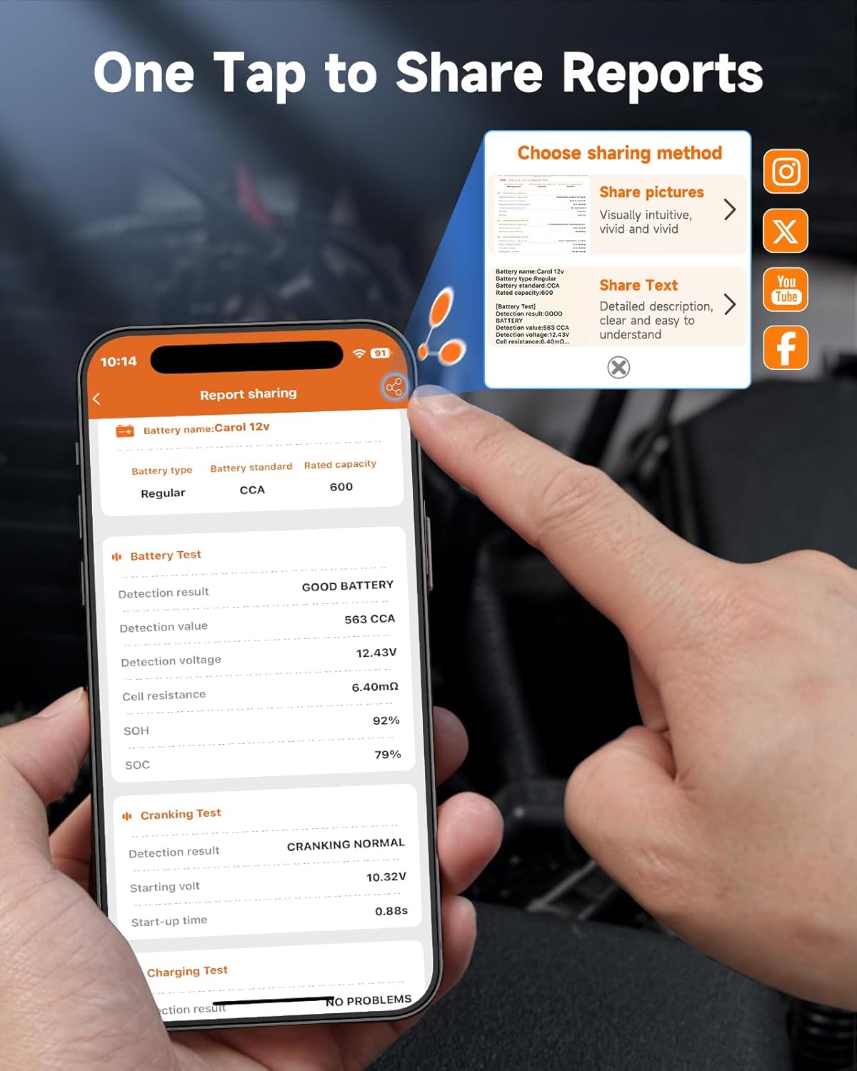 - Accurate Tracking Reliable Diagnostics – Assign custom names or tags to each battery for quick identification by vehicle, customer, or application. Track health and usage history over time for better maintenance decisions. Need to share test results? Instantly send detailed reports via text or image with a single tap on your phone or tablet—no printing, no paperwork. Ideal for shop techs, fleet managers, battery dealers, and DIYers alike, this compact FOXWELL battery tester keeps your workflow organized and efficient wherever the job takes you.