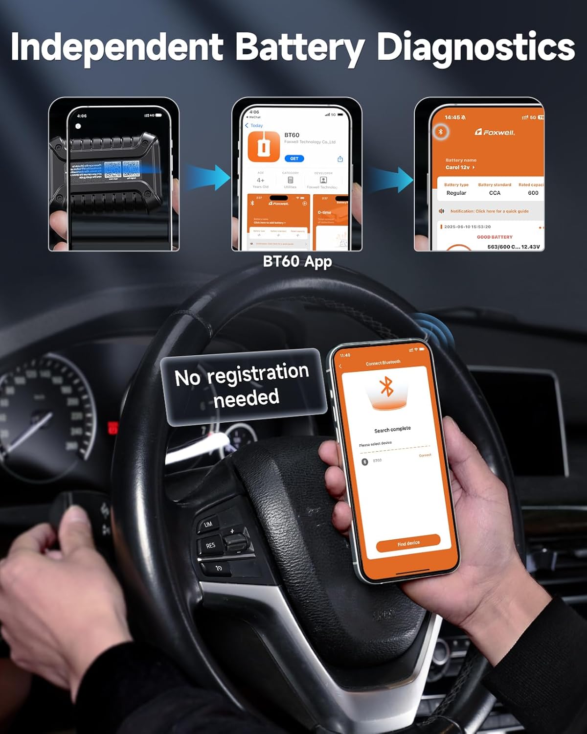 - Pro-Level Features Without the Pro Price - Why pay hundreds for features that now fit in your pocket? Backed by 14+ years of FOXWELL expertise, the BT60 12v battery tester delivers the advanced functions you’d expect from high-end testers—full app control, wireless Bluetooth connection, unlimited battery ID tagging, instant result sharing, and Quick Start Guide in-app support. Whether you're a pro tech or a hands-on DIYer, this tool gives you premium power without the premium price.