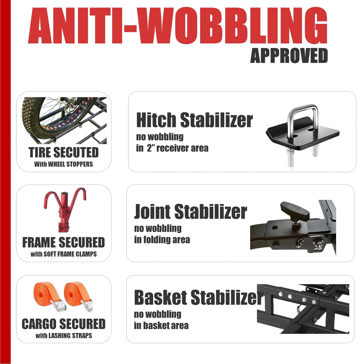 - STURDILY BUILT & EASY USE: Treated to resist rust and corrosion, this hitch cargo bike rack withstands tough weather conditions. The foldable design saves space and makes parking easy when not in use