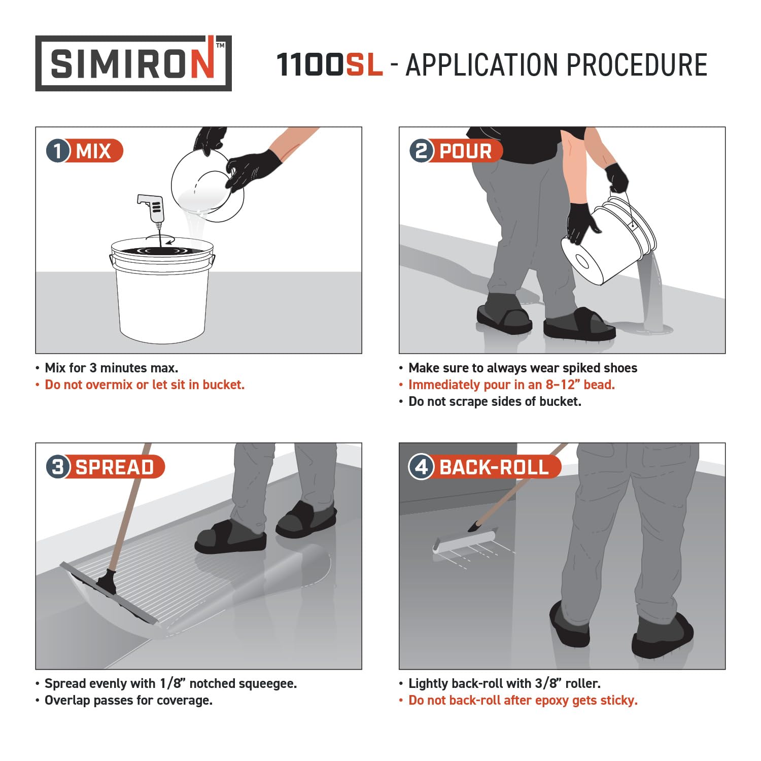 - EASY TO USE: 1100SL is perfect to use for residential, industrial, or commercial floor epoxy and countertops, the 1100SL basecoat is designed to be used over sealed concrete where high-build and durability are needed. This workhorse epoxy has toughness and good chemical resistance. Mix our 2:1 Base to activator ratio, then pour and spread. BE SURE TO NOT LET EXCESS PRODUCT SIT IN BUCKET AFTER MIXING, COMPLETELY POUR OUT AFTER MIX.