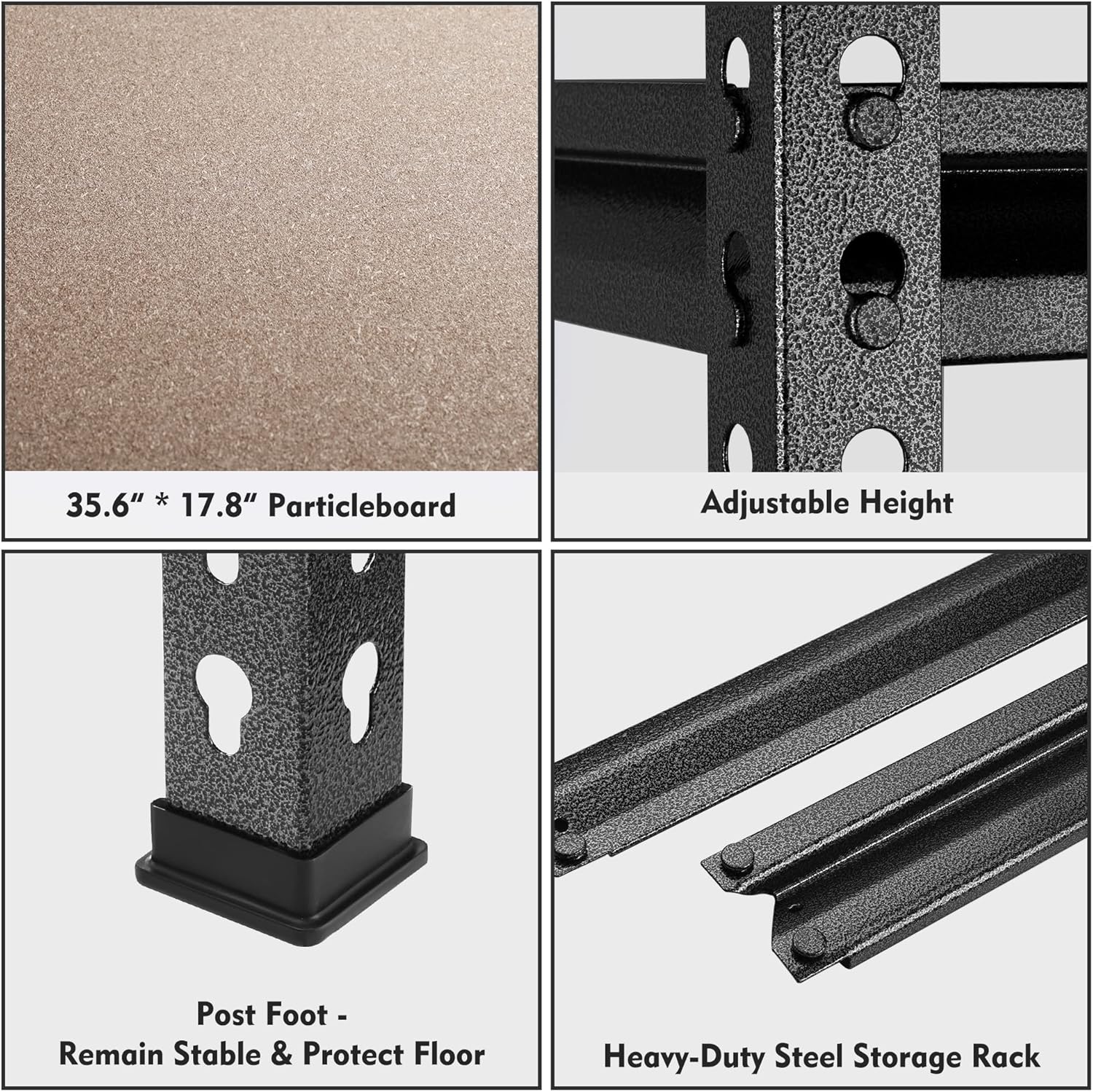 - 【4000 lbs Load Capacity】Made of high-quality metal frame and particle board, this shelving unit is more steady and tough than normal garage shelves. The maximum capacity is up to 4000 lbs total, 800 lbs per shelf, which can store much more stuff and tools in your garage or warehouse.