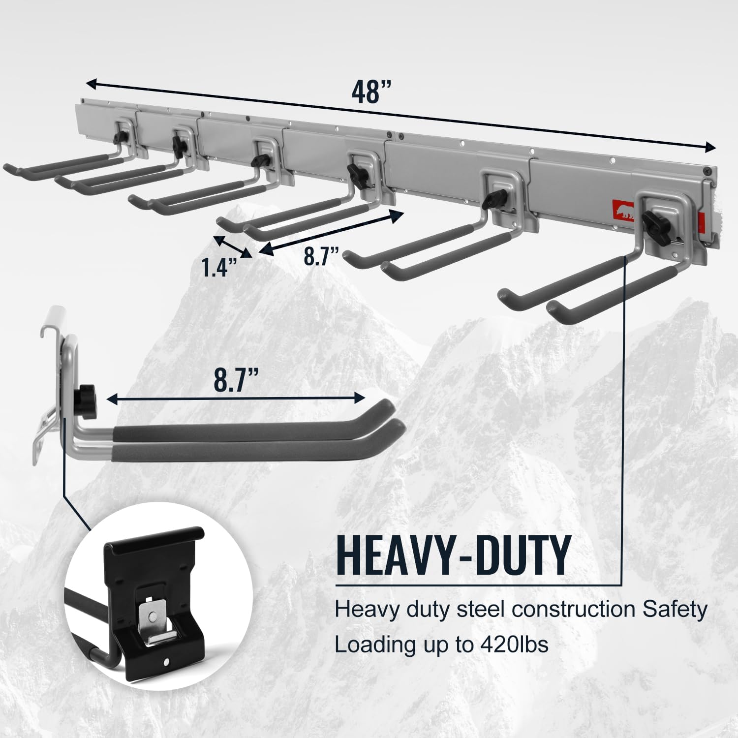 - HEAVY DUTY STEEL CONSTRUCTION: Crafted from industrial-grade steel, our garage tool hanger is incredibly durable, supporting up to 420 pounds—perfect for heavy garden tools. These heavy-duty garage hooks are designed to last and handle your toughest tools