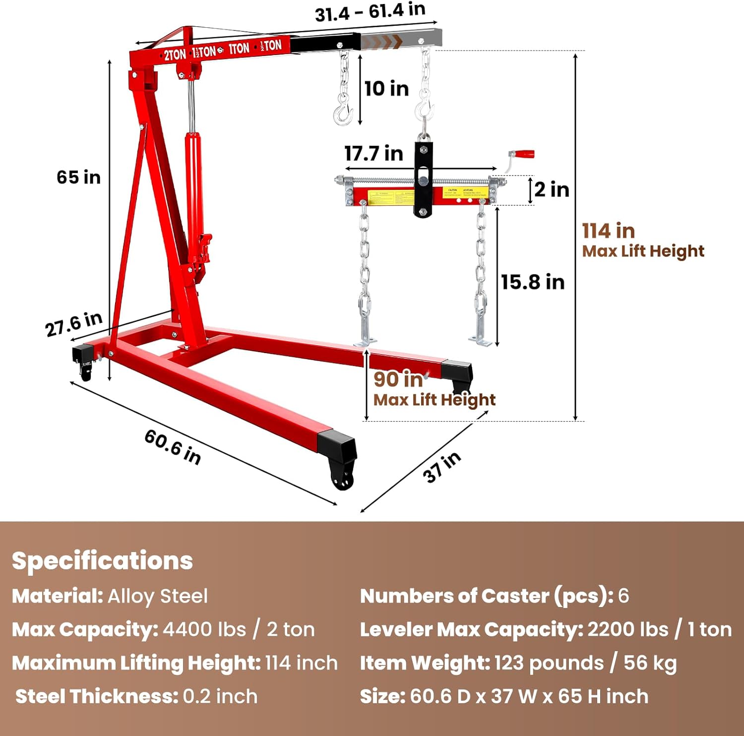- All-in-one convenience: Engine hoist combines the power of an engine crane and a leveling tool. Say goodbye to the hassle of purchasing separate equipment. Engine lift is equipped with a leveling tool that makes it easy to lift heavy loads and find balance at the same time