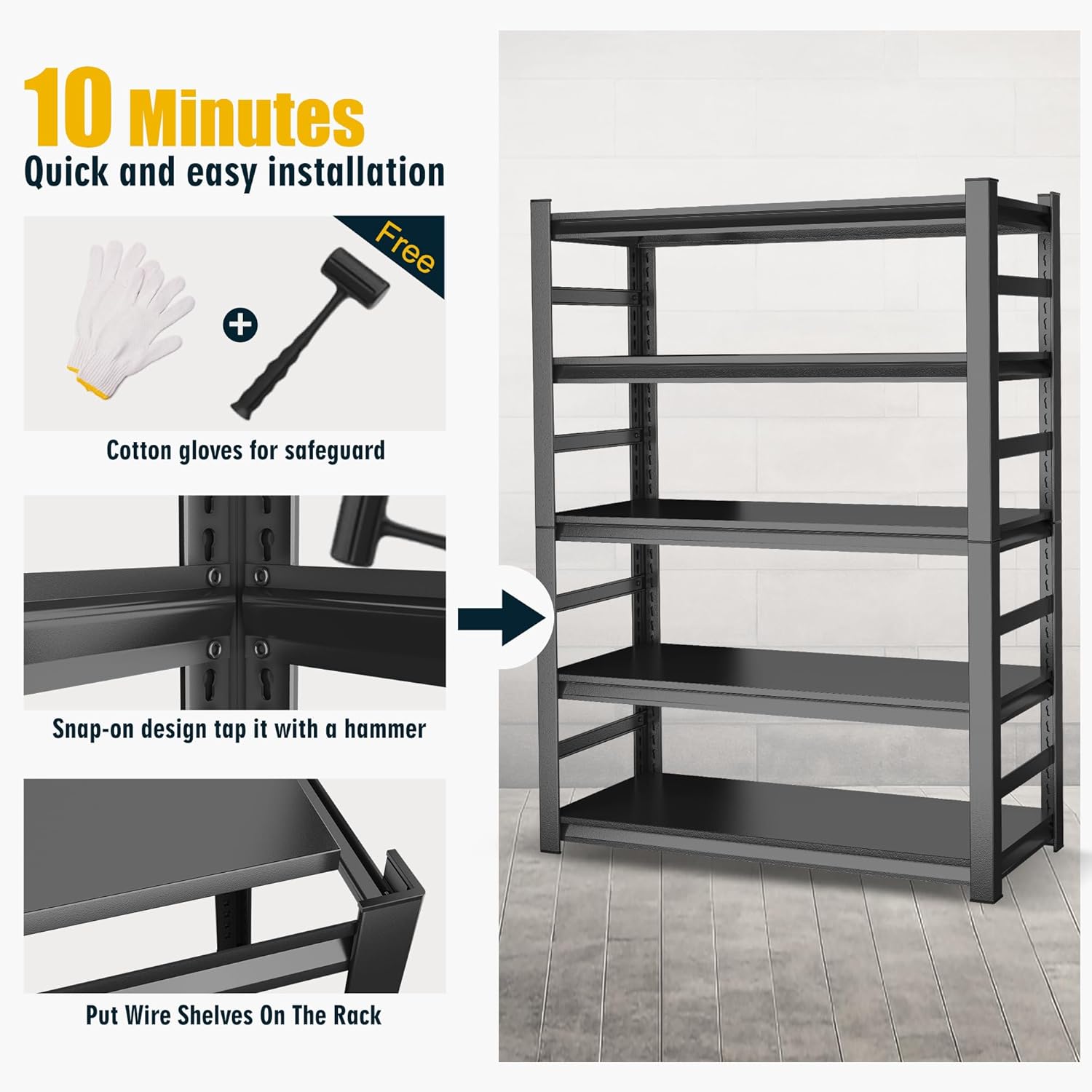 - ăTool free,Simple & Quick Assembly ă Our garage storage shelves are designed with bolt free interlocking, making it easy and fun to assemble them like building block toys.Comes with free rubber hammers and gloves, as well as detailed instructions and assembly videos, even children and the elderly can easily assemble within 10 minutes.
