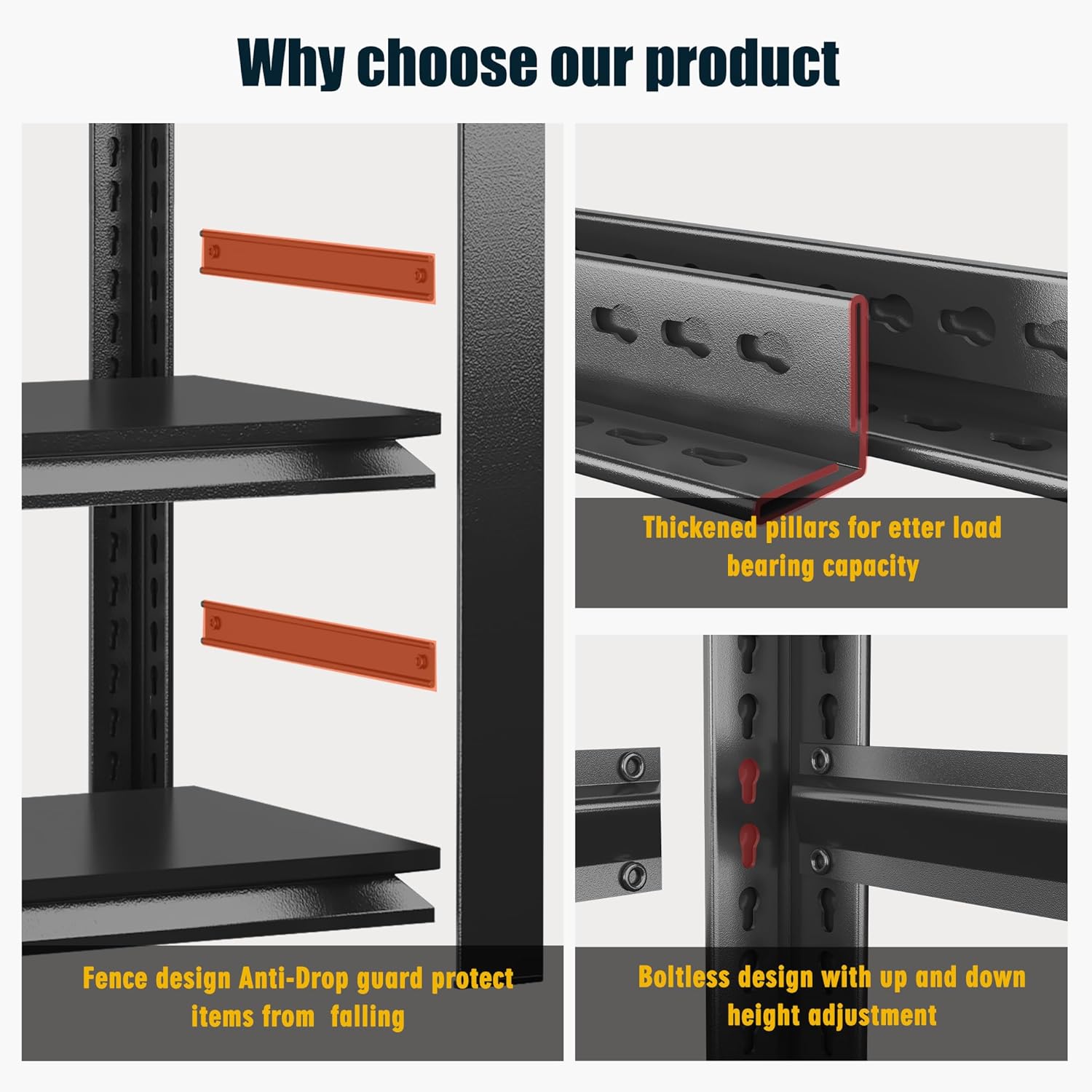 - ăGarage Shelving Heavy DutyăïŒOur metal storage shelves are made of heavy-duty steel and have been upgraded to double layered columns, each with supporting ribs, and the surface of the shelves is coated with high-quality powder coating. It is not only sturdy and durable, but also ensures that the shelf maintains its appearance and performance in various environments. Each shelf can carry up to 900 pounds, and the maximum weight capacity of 4500 lbs.