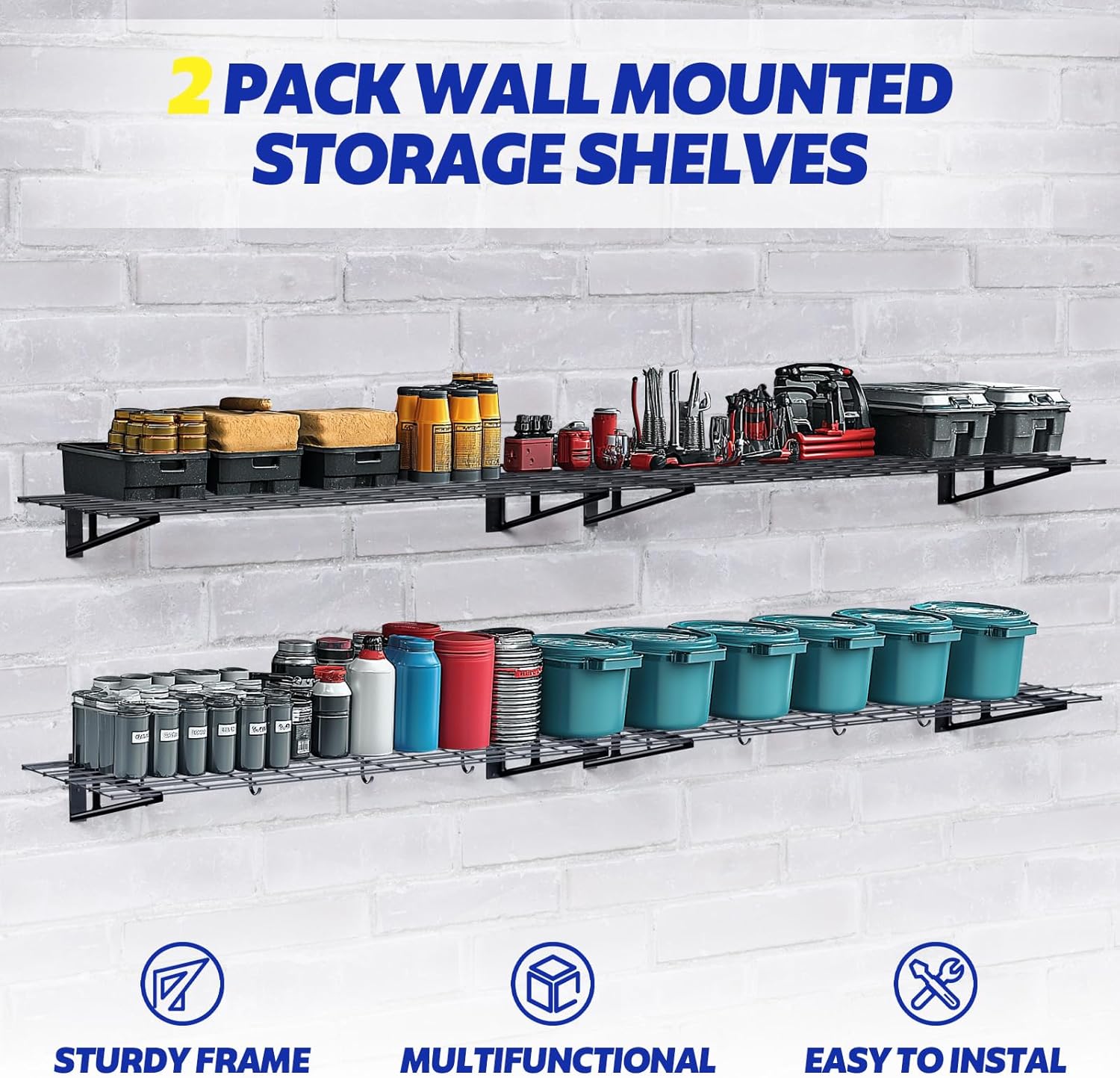 FAHKNS 2 x 6 ft Garage Wall Shelving, 2-Pack Garage Shelving Wall Mounted, 1200LBS Capacity Heavy Duty Metal Wire Shelves, Floating Long Shelf for Carport Shed Kitchen, Black
