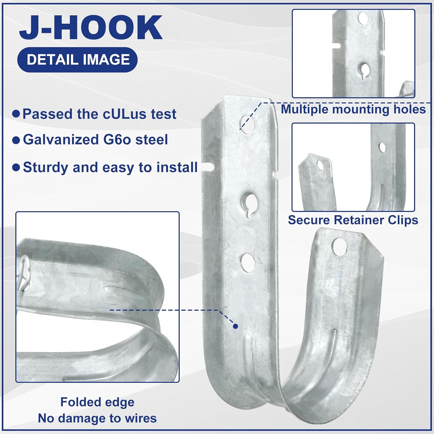 - Robust Material: the j hooks for hanging are constructed from dependable and rust resistant G60 galvanized steel, the heavy duty structure imparts them the ability to withstand regular wear and tear, and these j hooks can hold up to 60 lbs each; The hooks have UL certification, consolidating their reliability and toughness in supporting cables and wires