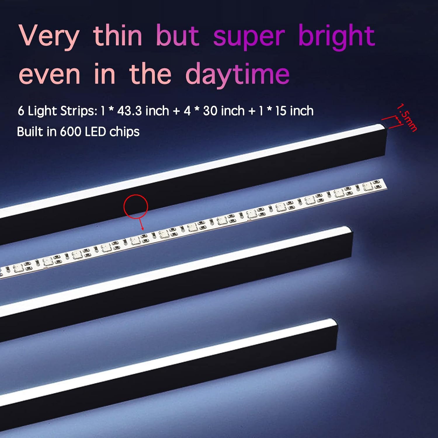 - High Bright and Uniform: Our acrylic light strip is equipped with 600+LED chips, and the dense and bright LED scatter light through the acrylic, making our light bright, soft, and vivid. Higher uniformity than traditional fiber optic lights and most indoor light strips in rooms. Bright, soft, and highly uniform lighting adds a comfortable atmosphere and tidy to your car.