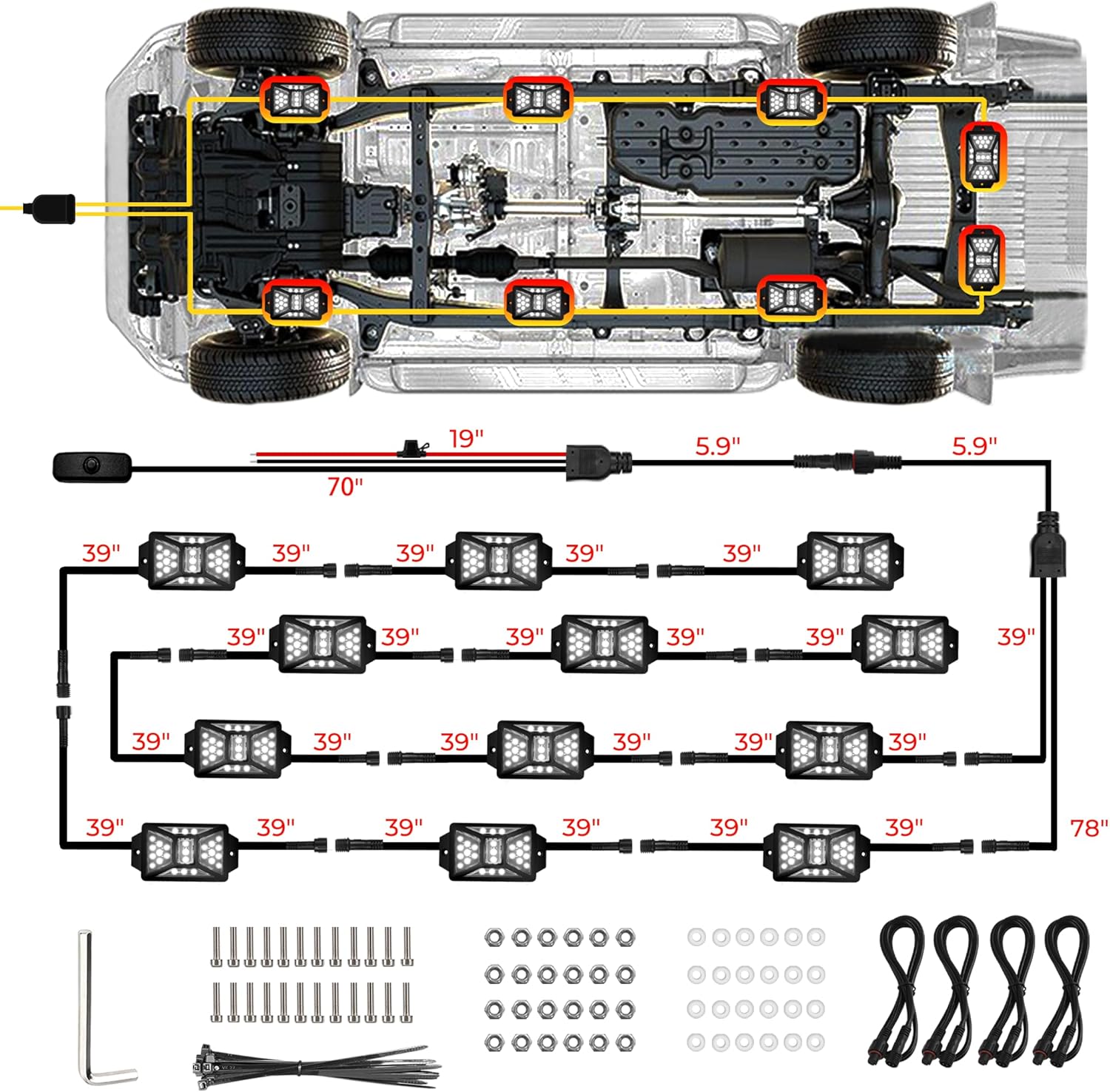 - ăConvenient Wiring Harness ConnectorăOur utv rock lights come with specialized wiring harness connectors (splitters) designed for easy connection to each pod light