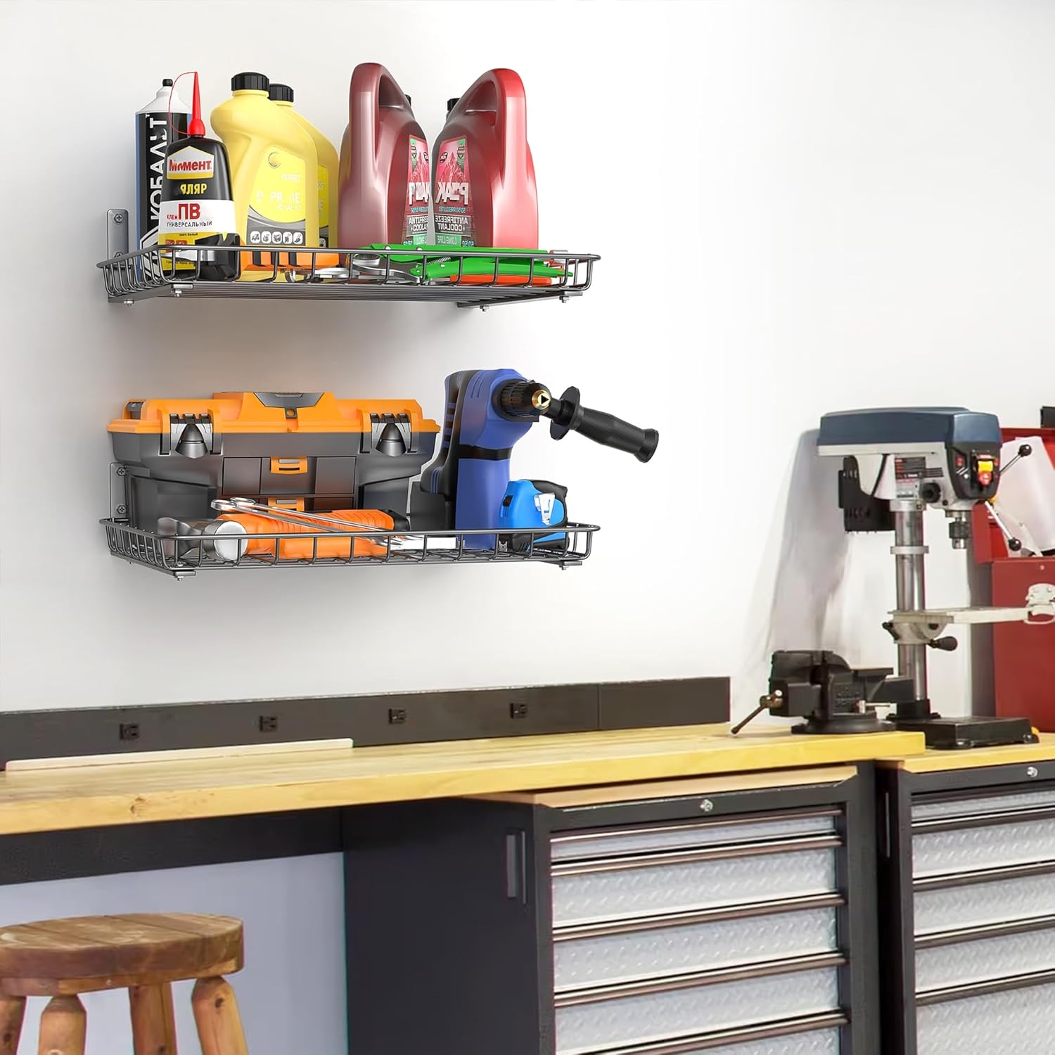 - Sturdy Metal Shelves: Made from high-quality steel with a powder-coated finish, these garage wall shelves hold up to 60 lbs per shelf