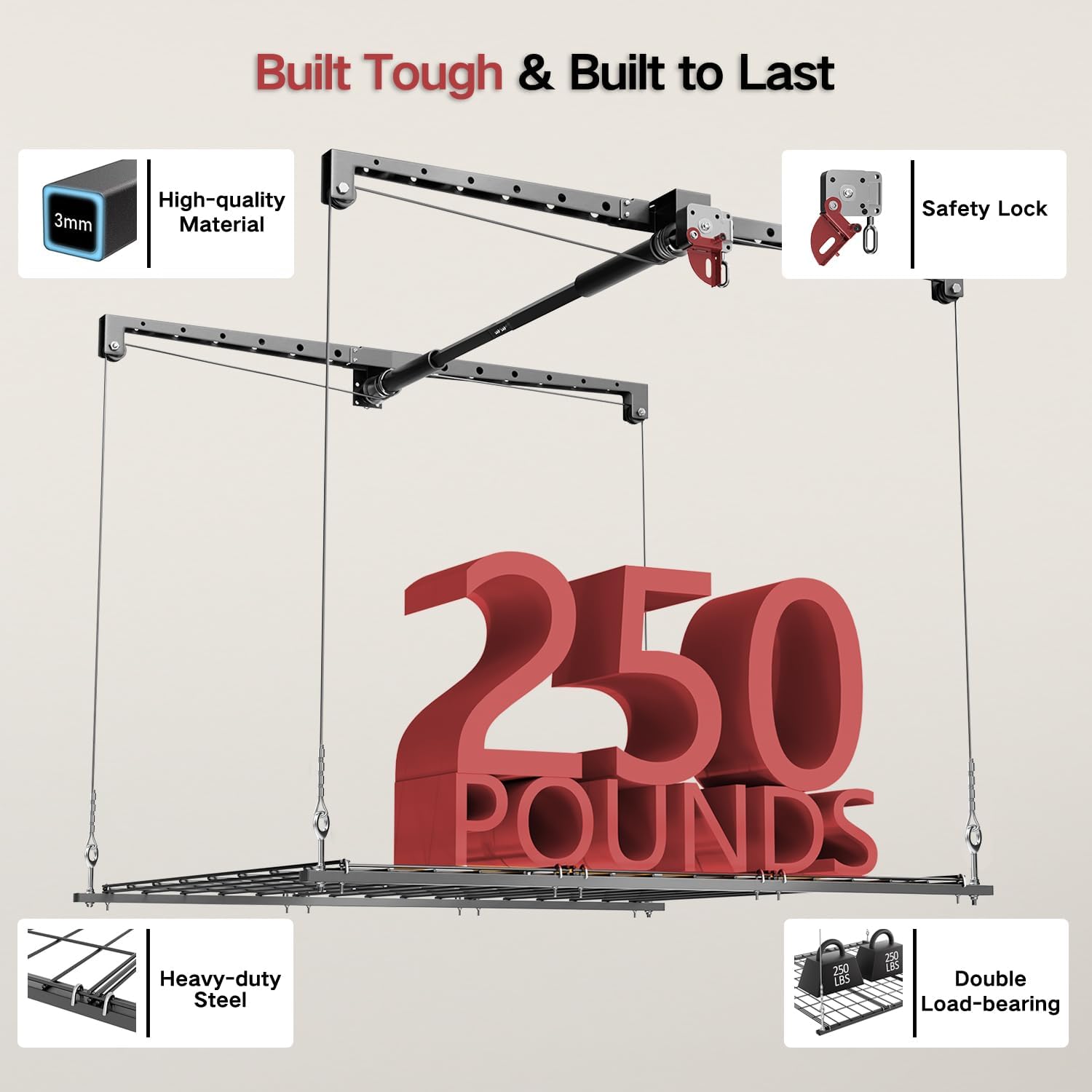 - Innovative Design for Easy Access: Elevate your garage organization with this overhead garage storage lift. Unlike traditional garage storage shelves, our product allows for effortless access, making storing and retrieving items a breeze, without the need for ladders.